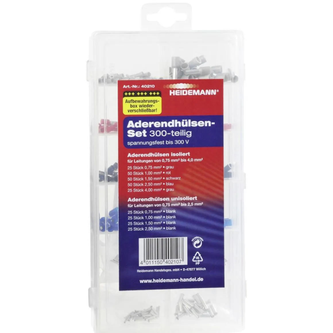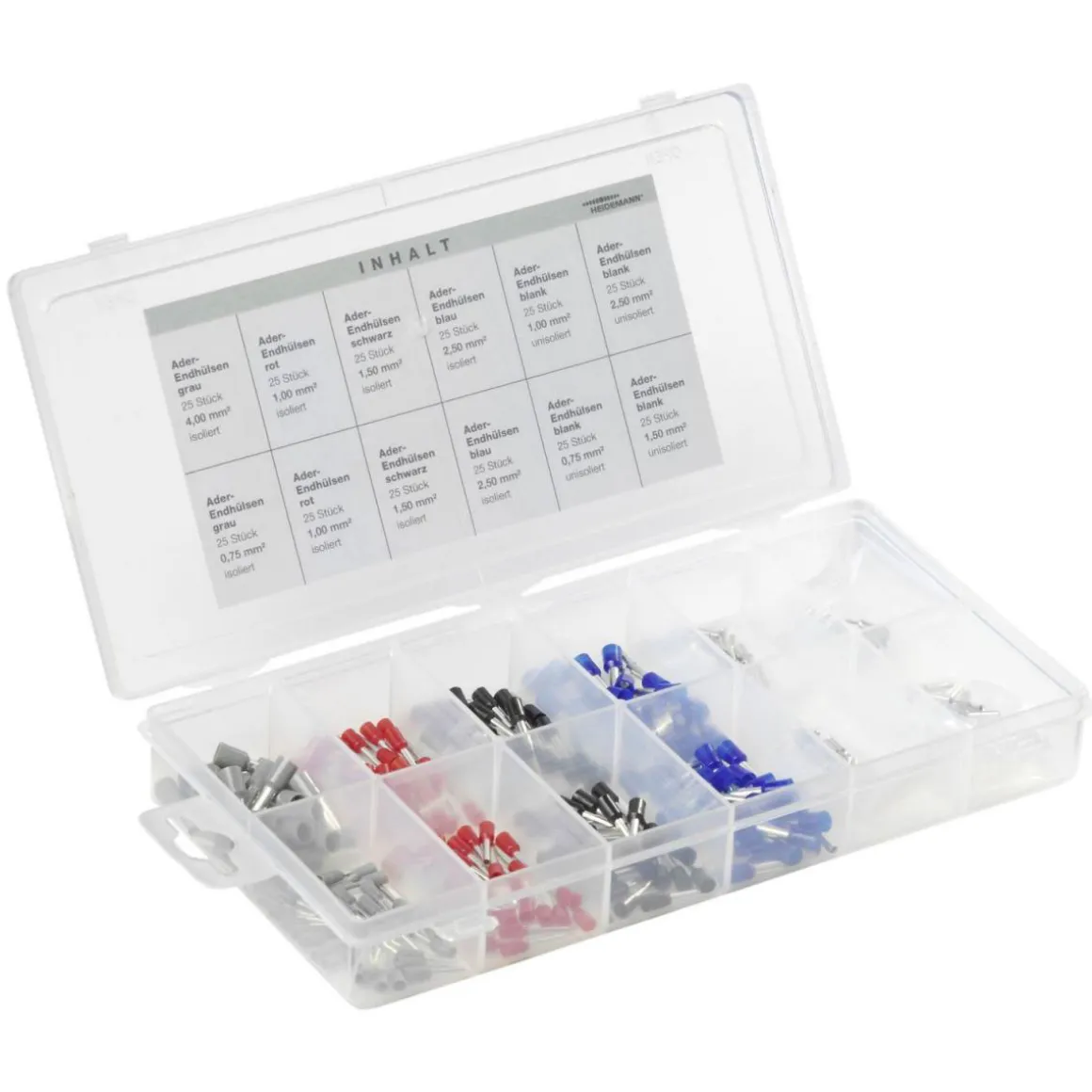Mit dem Aderendhülsen-Set von HEIDEMANN sind Sie bestens ausgestattet, um Ihre Elektroarbeiten erfolgreich durchzuführen. Das Set enthält 300 Adernendhülsen in verschiedenen Farben und ist spannungsfest bis zu 300 V.