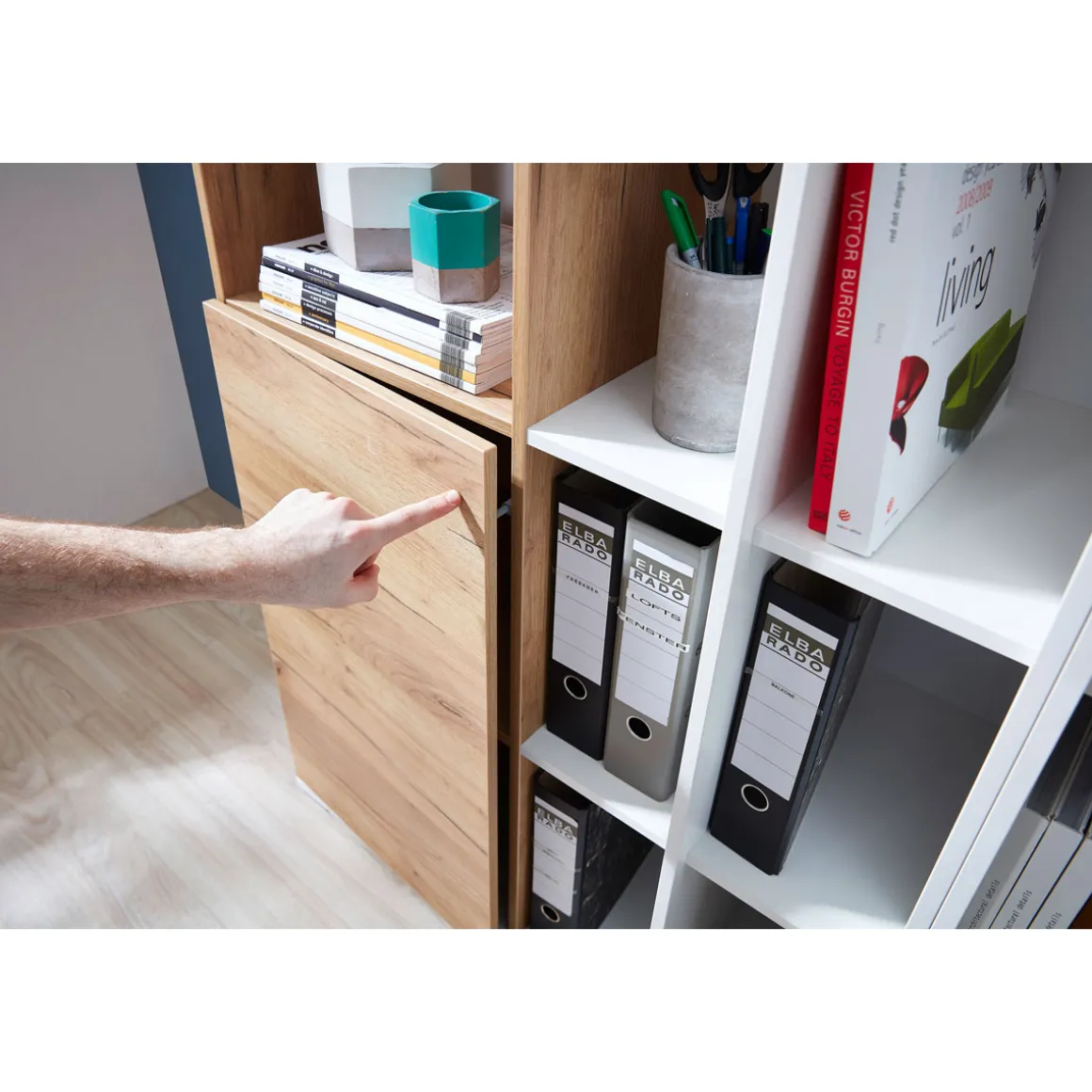 Der Aktenschrank Lionel in Weiß/Navarra-Eiche-Nachbildung ist die perfekte Kombination aus Stil und Funktionalität. Mit seinen offenen Fächern bietet er Ihnen nicht nur großzügigen Stauraum, sondern auch eine moderne Optik, die sich harmonisch in jedes Ambiente einfügt. Die innovative Push-to-open-Technik sorgt dafür, dass Sie Ihre Dokumente und Gegenstände mühelos verstauen können – ganz ohne störende Griffe. Dieses Möbelstück vereint hochwertige Materialien mit durchdachtem Design, sodass Sie sich auf langlebige Qualität verlassen können.