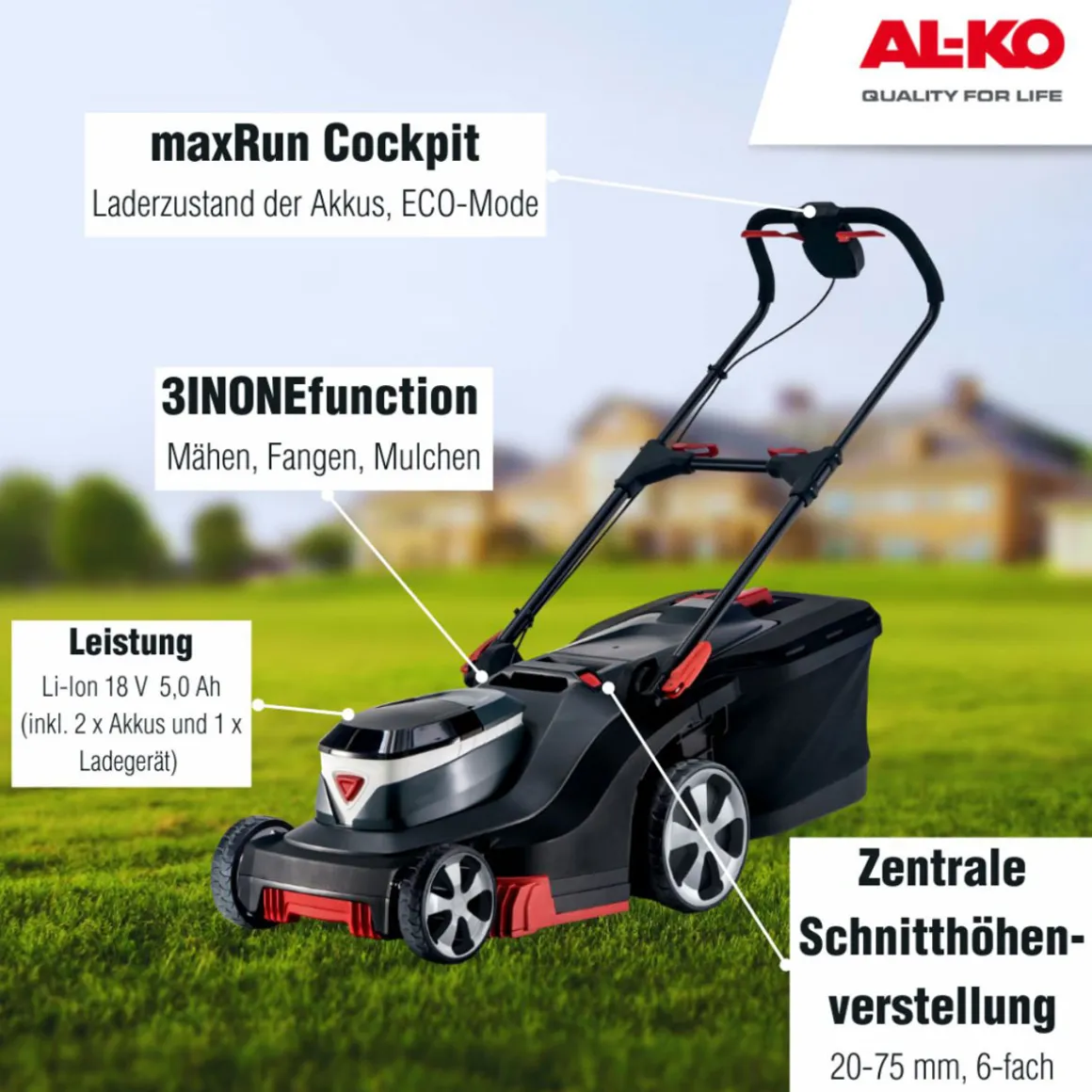 Der AL-KO Akku-Rasenmäher ist ideal für alle Gartenbesitzer geeignet, die eine Fläche von bis zu 400 m² mühelos pflegen möchten. Auch für umweltbewusste Menschen ist dieser Mäher eine gute Wahl, da er ohne Benzin oder Öl betrieben wird.