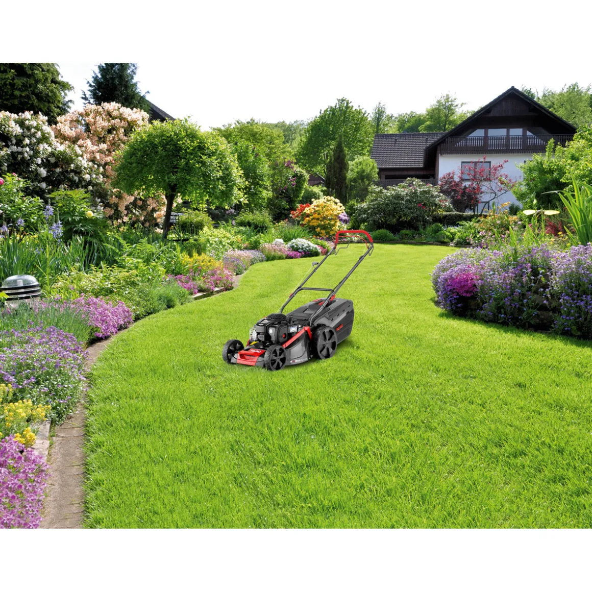 - Benzinbetriebener Motor mit einer Leistung von zwei Kilowatt (2 kW) sorgt für ausreichend Power beim Mähen