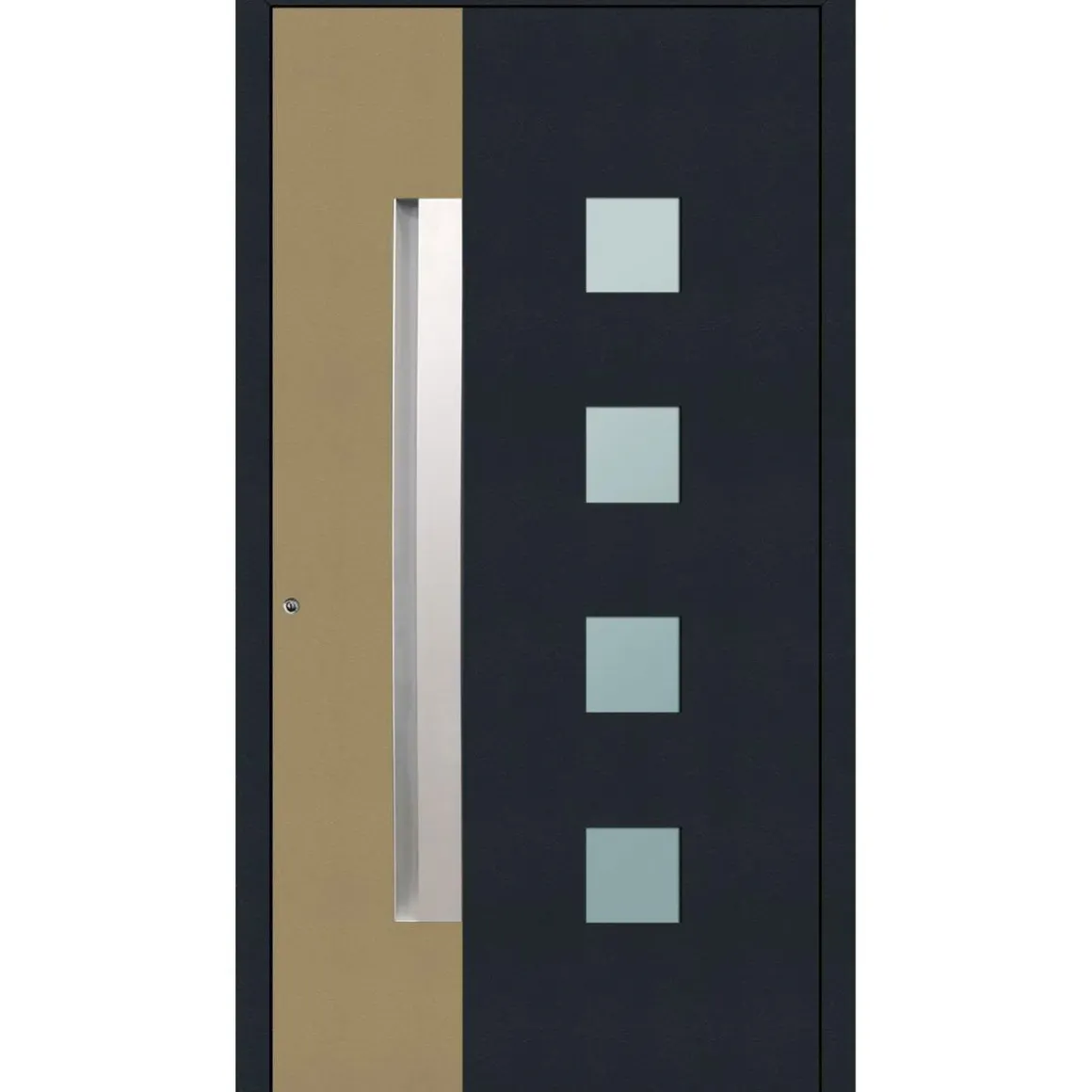 Sicherheitshaustür „Exklusiv“ inkl. Griffleiste!100% Aluminium mit hochwertiger Pulverbeschichtung – ohne Stahl, ohne Verwendung von Kunststoff oder Holz, ohne Dekorfolie auf der OberflächeTechnische Spezifikationen:- Ud-Wärmedämmwert 0,95 W/m²K- 75 mm beidseitig flügelüberdeckende wärmegedämmte Füllung ohne sichtbares Flügelprofil- Aluminium Profil Bautiefe 77 mm- Thermisch getrennte Bodenschwelle aus Aluminium mit verbesserter Wasserdichtigkeit- 3-fach Schwenkhaken-Sicherheitsverriegelung- 2 Stück dreidimensional verstellbare Rollenbänder- 2 Stück Aufhebelsicherungen (Bandseitensicherung)- 4-fach Isolierverglasung VSG 33,4 (P4A), innen und außen satiniert- inklusive innenliegende Griffleiste Weitere Wünsche wie Sonderfarben, Sondermaße und Zubehör (Spione, Smart-Home, Griffe) erhalten Sie auf Wunsch mit ausführlicher Beratung nur in unseren Märkten! Wichtiger Hinweis: Diese Haustür ist eine Sonderanfertigung, das Widerrufsrecht ist ausgeschlossen (ausgenommen Mängel).