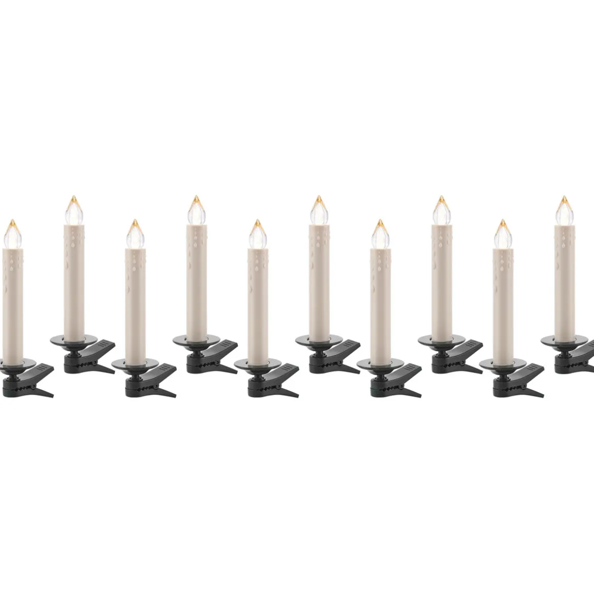 Das kabelloste LED-Kerzen-Set ist batteriebetrieben und für den Innenbereich geeignet. Die Batterien sind nicht im Lieferumfang enthalten. Benötigt werden 10 x AAA Batterien. Die Kerzen haben die Farbe elfenbein und jede Kerze hat eine warmweiße LED. Zwei Lichtintervalle können ausgewählt werden. Die Variante starr oder flackernd / dimmbar. Jede Kerze hat ein Befestigungsclip. Zudem ist eine IR Fernbedienung in dem Set enthalten. Eine Kerze hat die Höhe 12,5 cm und einen Durchmesser von 1,4 cm.