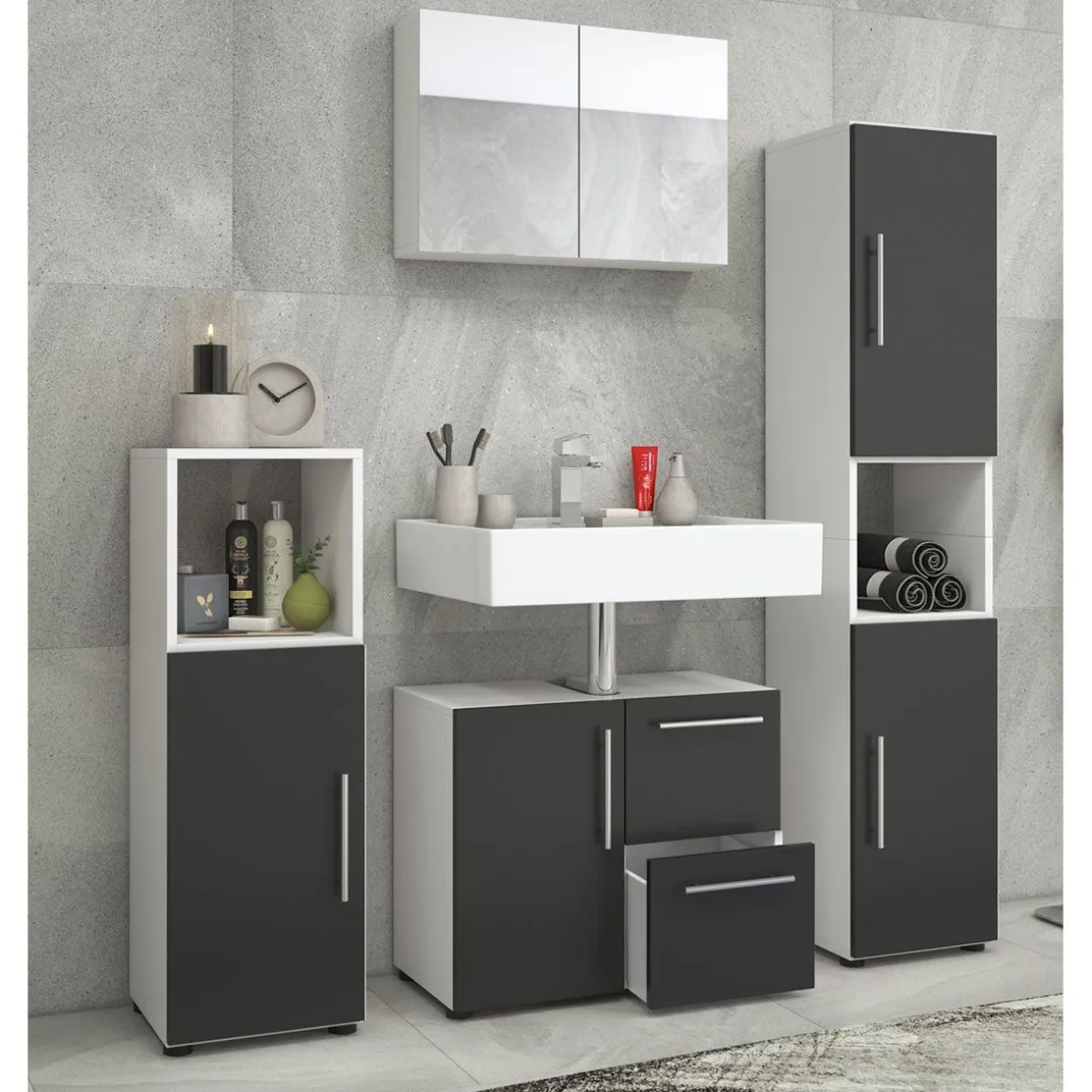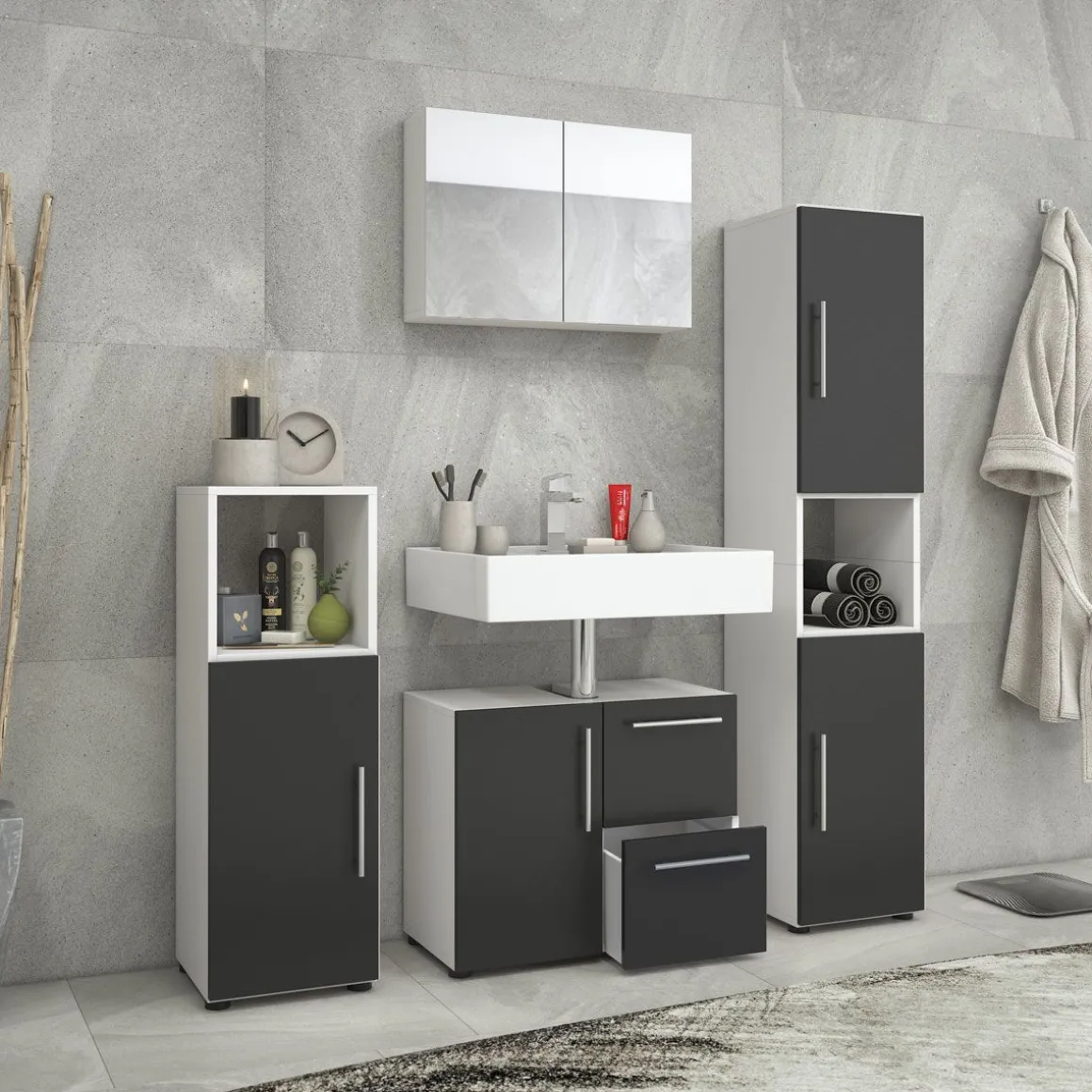 – Maße ca. H. 41,5 x B. 60 x T. 12 cmDiese moderne Badmöbelkombination bietet viel Stauraum und sorgt somit für Ordnung im Raum. Das edle und klassische Design passt in jedes Bad.