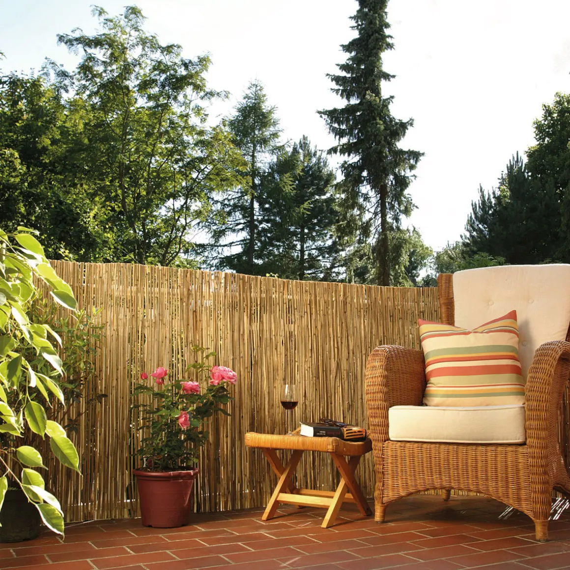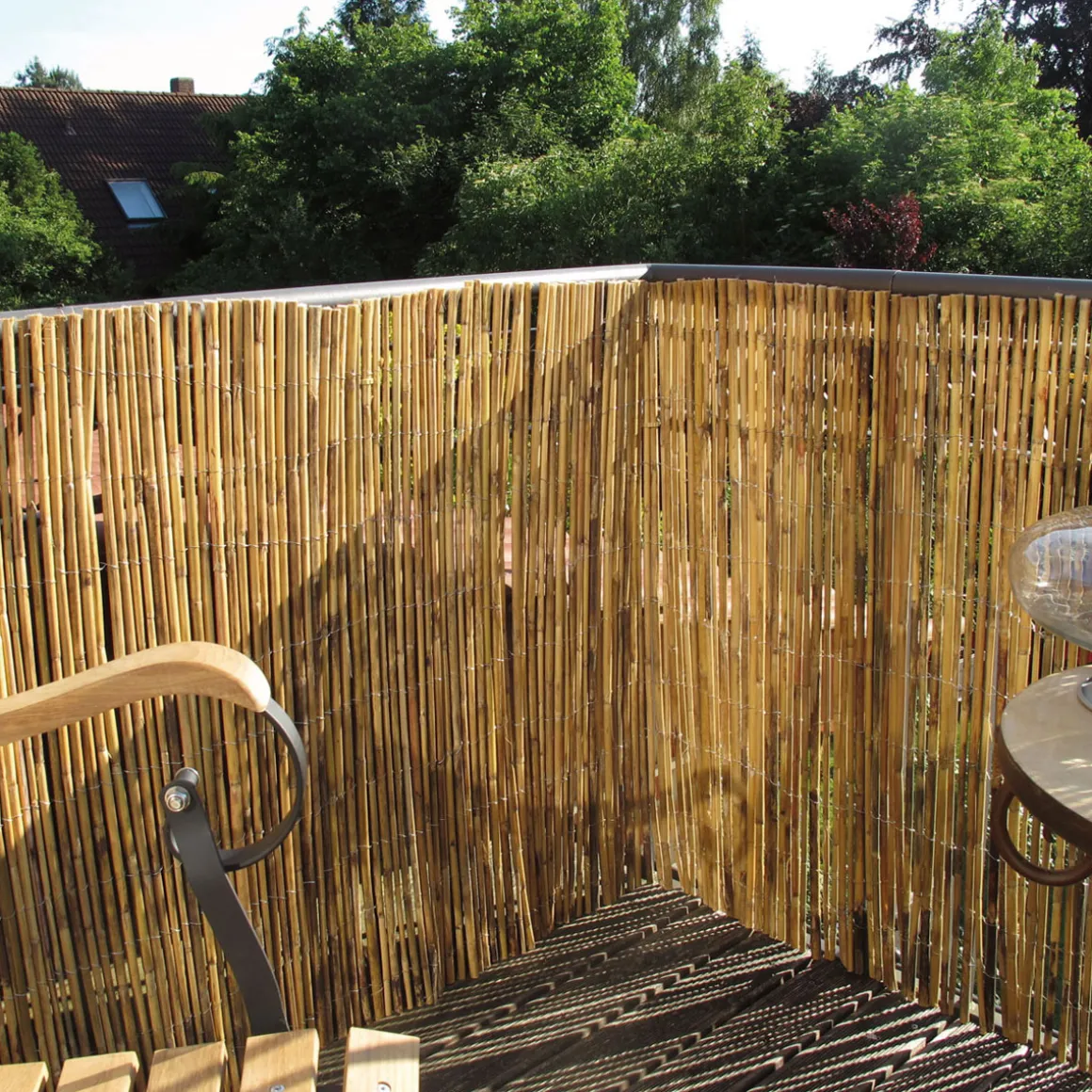 Mit der Bambusmatte Hongkong schaffen Sie eine angenehme Atmosphäre auf Ihrer Terrasse oder Ihrem Balkon. Die natürliche Optik und die leicht durchscheinende Struktur des Materials sorgen für ein harmonisches Ambiente.
