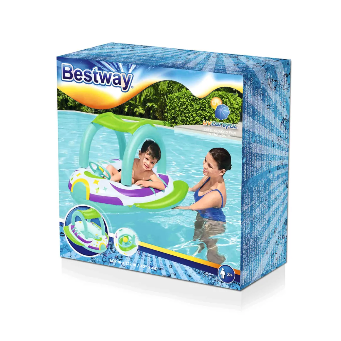 Das Kinder-Schlauchboot hat aufgeblasen die Maße BxHxT 98x95x61 cm. Es hat ein abnehmbares Sonnenschutzdach und ist bis 30 kg belastbar.