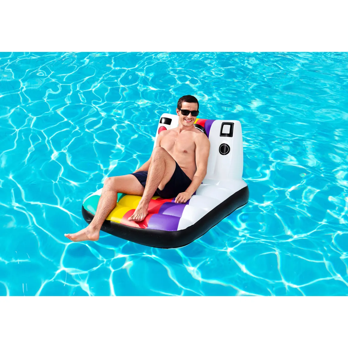 Die Luftmatratze hat aufgeblasen die Maße 95x95x68,5 cm. Sie besteht aus strapazierfähigem PVC. Sie hat eine komfortable Rückenlehne und Sicherheitsventile. Die Luftmatratze hat eine Belastbarkeit bis maximal 90 kg. Im Lieferumfang ist ein Reparaturflicken enthalten.