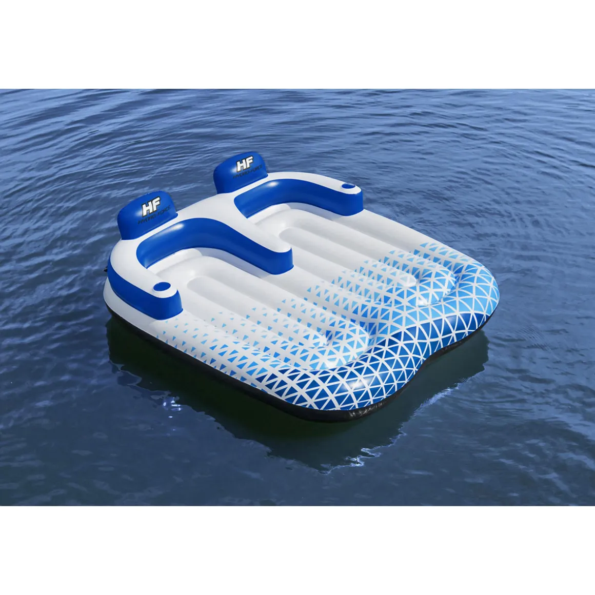 Die Poolliege hat aufgeblasen die Maße 183x176x56 cm. Sie besteht aus reißfestem Inflata-Shield-Material. Sie ist für 2 Personen geeignet und hat komfortable Armlehnen und Kopfstützen. Zudem sind zwei integrierte Getränkehalter, Schnellverschlussventile und Sicherheitsventile vorhanden. Die Poolliege ist bis maximal 180 kg belastbar. Im Lieferumfang ist auch ein Reparaturflicken vorhanden.