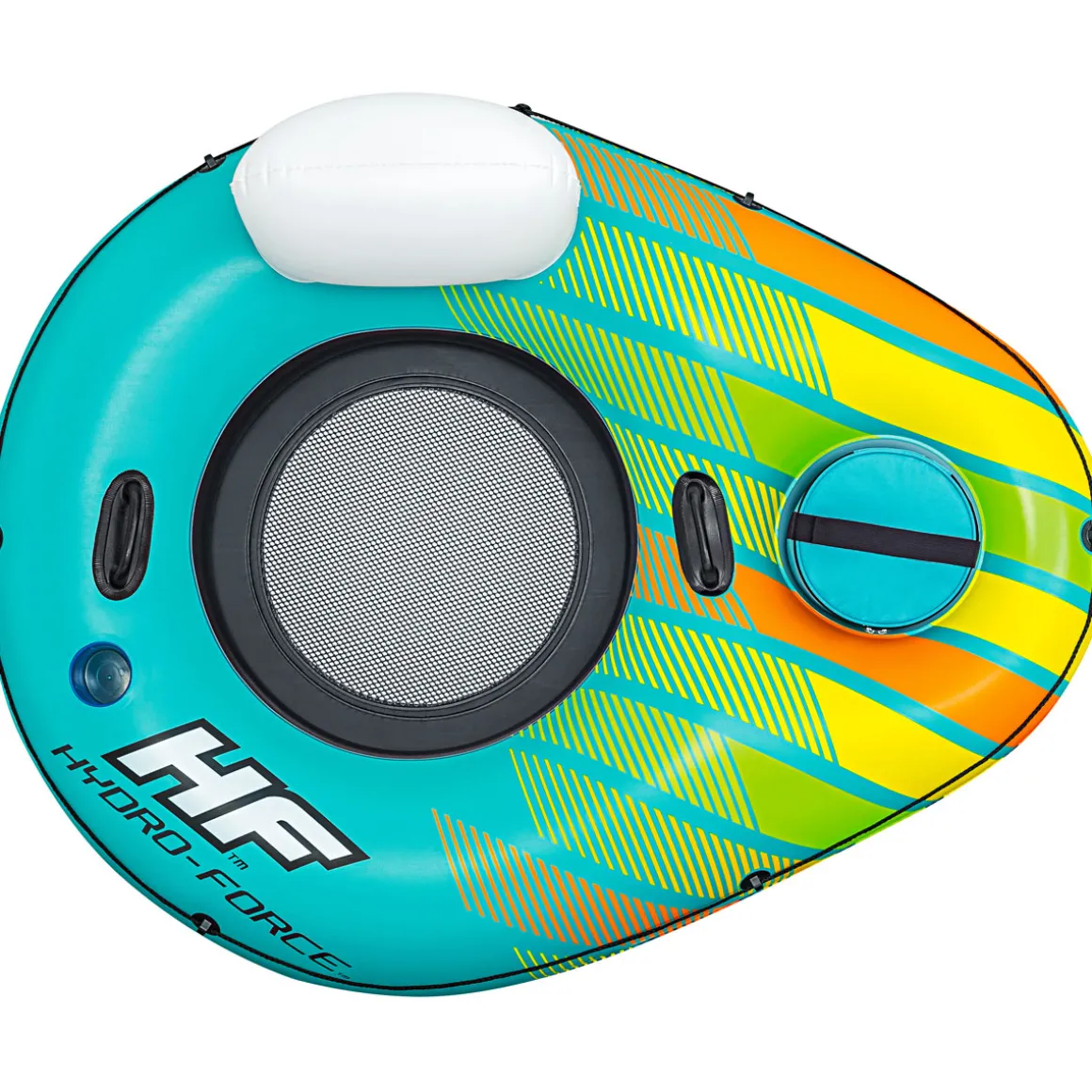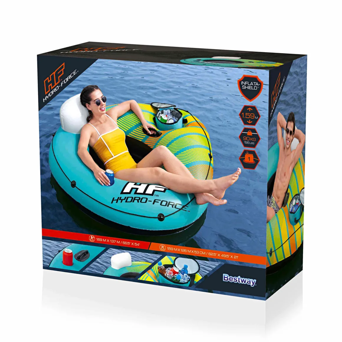 Der Schwimmring hat aufgeblasen die Maße 159x126x53 cm. Er besteht aus reißfestem Inflata-Shield-Material. Der Schwimmring ist für eine Person geeignet und hat eine integrierte Rückenlehne, eine Netz-Sitzfläche, robuste Haltegriffe, einen integrierten Getränkehalter, eine umlaufende Halteleine und Sicherheitsventile. Der Schwimmring hat eine Belastbarkeit von maximal 90 kg. Enthalten ist zudem eine herausnehmbare Kühltasche und ein Reparaturflicken.