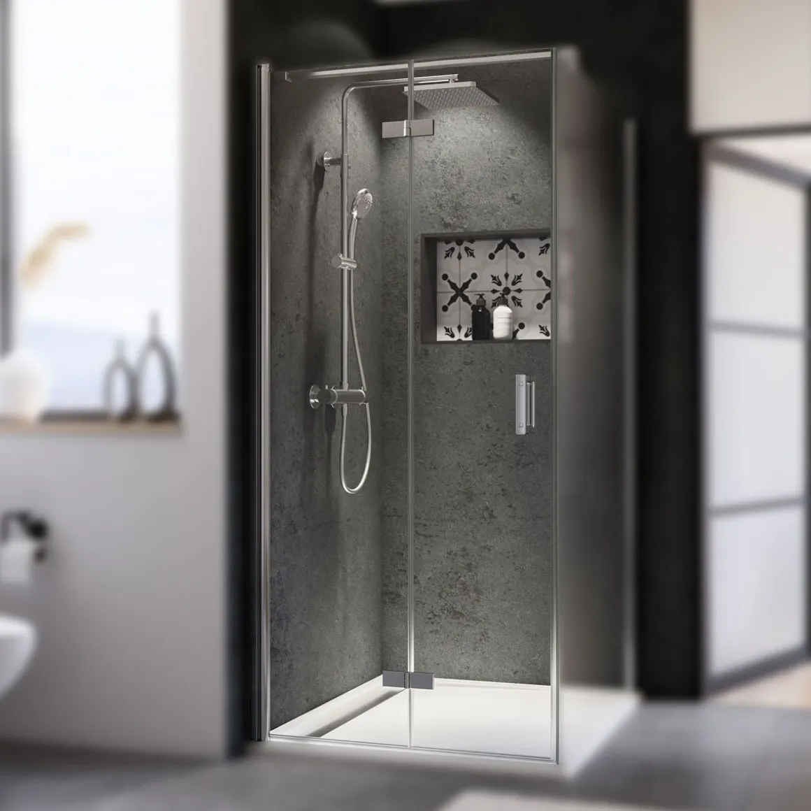 Die Breuer Drehfalttür Panorama eignet sich ideal für Kunden, die eine moderne Türlösung suchen, die Platz spart und dennoch stilvoll aussieht. Die graue Tönung des Glases bietet Sichtschutz und schafft eine angenehme Atmosphäre im Raum.
