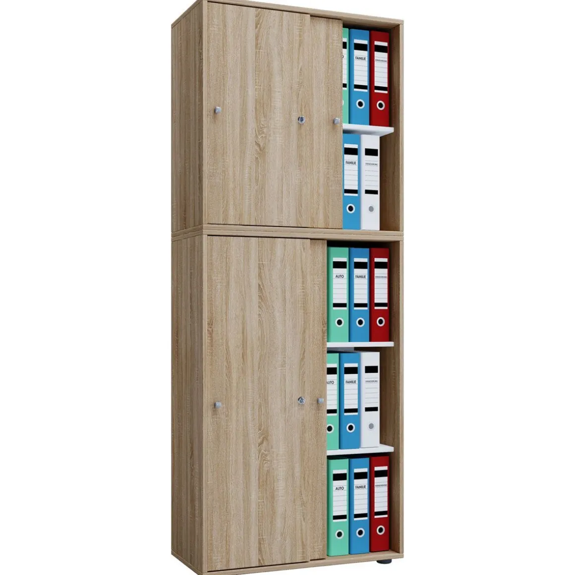 – Maße ca. B. 70 x H. 184 x T. 40 cm Der VCM Büroschrank „Lona XXL“ mit abschließbaren Schiebetüren hat ein vier Fachböden und Platz für 35 Aktenordner und andere Utensilien. Der Korpus besteht aus einer Holzstruktur-Nachbildung und besitzt eine stabile Rückwand.