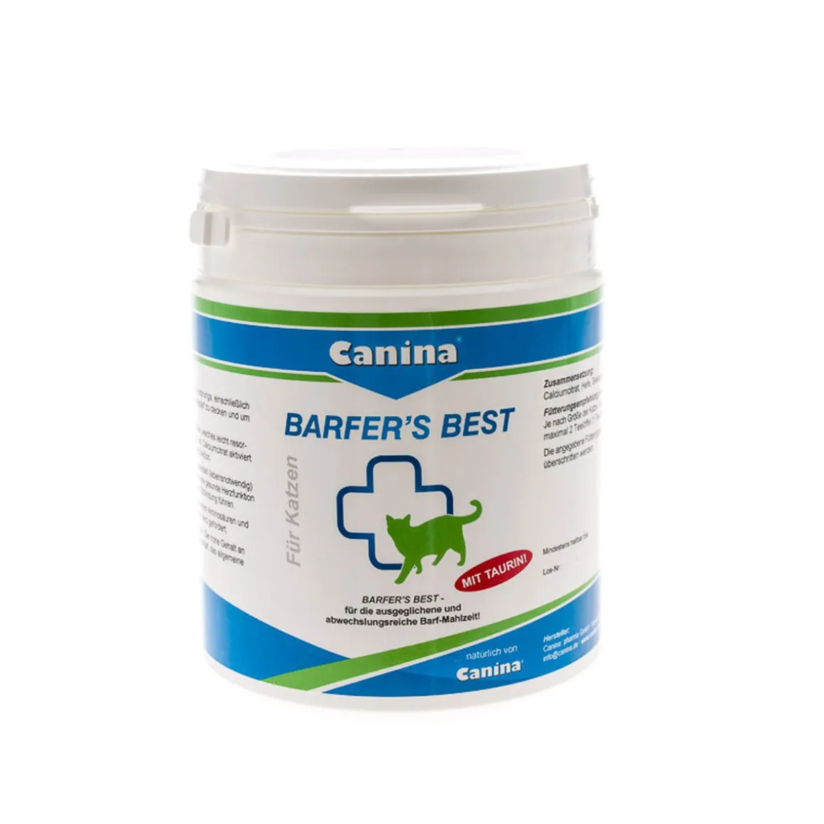 Das Barfen wird unter Katzenhaltern immer populärer. Barfer’s Best for Cats beinhaltet alle Vitamine und Mineralstoffe natürlichen Ursprungs, einschließlich Calcium, die eine mit Rohfleisch gefütterte Katze täglich benötigt, um seinen Bedarf zu decken und leistungsfähig und aktiv zu bleiben. Es ist somit eine ideale Nahrungsergänzung bei „Biologisch Artgerechter Roh-Fütterung“. Barfer’s Best for Cats enthält: – alle Vitamine und Mineralstoffe natürlichen Ursprungs, einschließlich Calcium, die der mit Rohfleisch gefütterte Katze täglich benötigt, um seinen Bedarf zu decken und um leistungsfähig und aktiv zu bleiben. – Calciumcitrat als Calciumquelle, welches leicht resorbierbar und unentbehrlich für Knochenbau, Zähne, Krallen und Muskulatur ist. Calciumcitrat aktiviert zahlreiche Enzymsysteme, steuert Nervenimpulse und unterstützt die Herztätigkeit. – die Aminosäure Taurin, welche für Katzen essentiell (lebensnotwendig) ist. Katzen können Taurin nicht selbst produzieren. Taurin ist unentbehrlich für eine gesunde Herzfunktion und unterstützt die Sehkraft. Taurinmangel über eine längere Zeit kann zur Erblindung führen. – Natürliche Seealgen liefern Vitamine, Mikromineralien wie Jod, Fluor und Enzyme, außerdem Aminosäuren und Enzyme. Die Pigmentierung von Haarkleid, Nasenspiegel und Pfotenballen wird gefördert. – Hefe liefert alle übrigen Vitamine, einschließlich die der B-Gruppe und Biotin. Der hohe Gehalt an Enzymen, Mineralstoffen und Spurenelementen fördern die Leistungsbereitschaft, das allgemeine Wohlbefinden und schützt Haut und Haare.