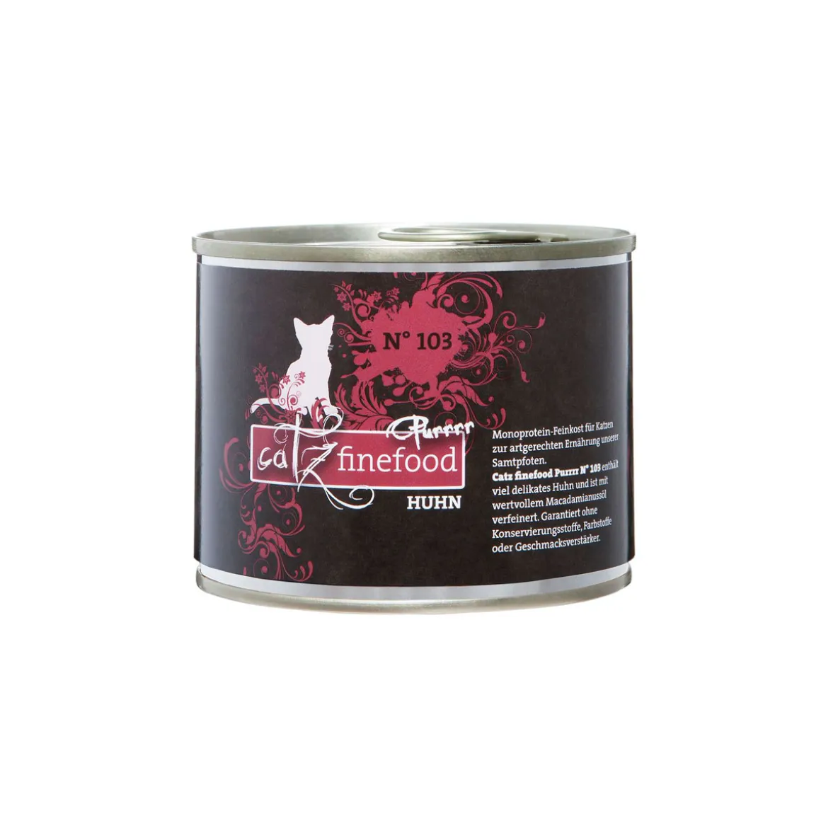 Monoprotein-Feinkost für Katzen zur artgerechten Ernährung unserer Samtpfoten. Catz finefood Purrrr No. 103 enthält leckeres und allergenarmes Huhn, die Kochbrühe, Mineralstoffe und Macadamianussöl – mehr nicht. Damit ist es ein sehr hochwertiges Katzennassfutter, dass nicht nur super schmeckt, sondern auch für ernährungssensible oder mit Futtermittelunverträglichkeiten geplagte Katzen bestens geeignet ist. In der Kürze der Zutatenliste liegt die Qualität! Ohne Konservierungsstoffe, ohne Geschmacksverstärker und ohne Farbstoffe. Gentechnikfrei. Mmmmiau!