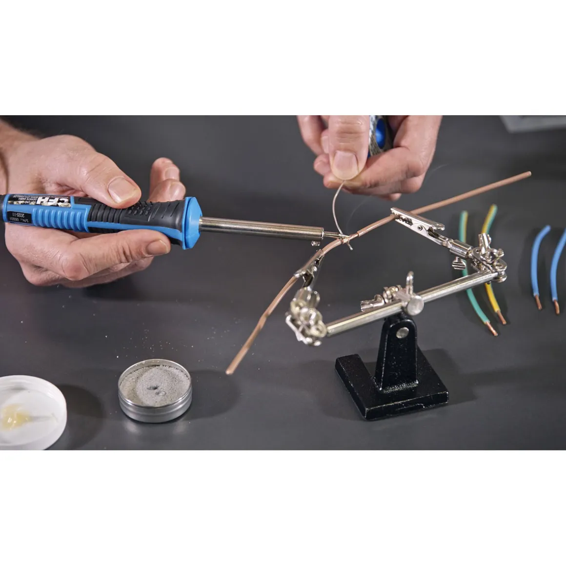 Mit dem CFH Elektroloetkolben E15 haben Sie das perfekte Werkzeug für Ihre Elektrolötarbeiten gefunden. Der Lötkolben überzeugt durch seine schnelle Aufheizzeit, sein geringes Gewicht und seine hohe Höchsttemperatur von 370°C.