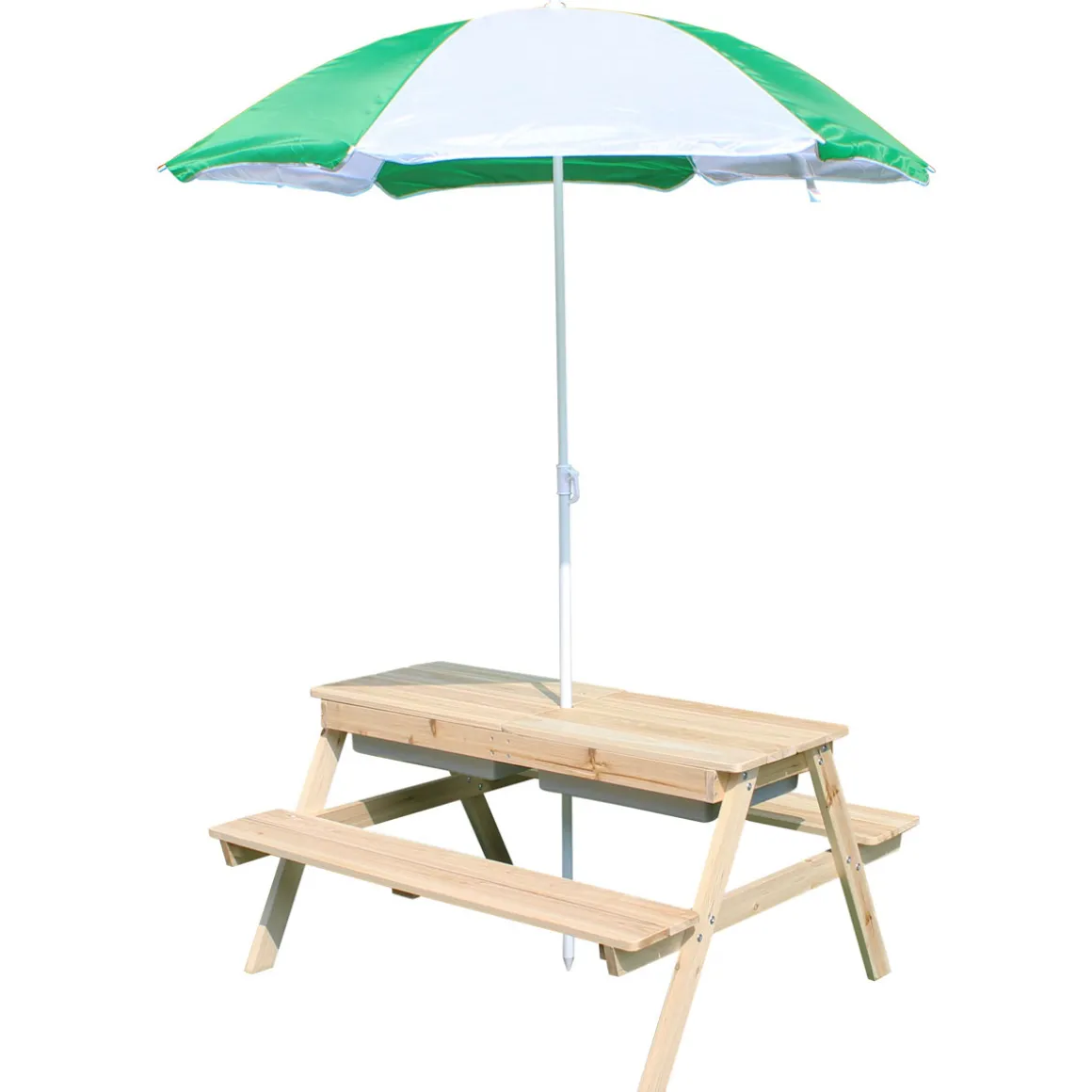 Mit diesem tollen Picknicktisch-Set mit Wasserbecken und Sonnenschirm kann Ihr Kind und seine Freunde viele schöne Nachmittage verbringen. Das Gartenset ist perfekt für Picknicks, zum Sand- und Wasser-Spielen oder für Besuch auch an sonnigen Tagen. Der Picknicktisch und die Bank aus massivem Holz sind äußerst robust und langlebig, aber dennoch leicht. Die Bänke und der Tisch haben genau die richtige Größe für Kinder. Unter der abnehmbare Tischplatte kommen zwei Wannen aus Kunststoff zum Vorschein. Es ist der ideale Platz für Kinder, um mit Sand, Wasser und Naturmaterialien ihre Umwelt zu entdecken. Freunde und Spielzeuge sind ebenfalls willkommen. Dank des verstellbaren großen Sonnenschirms, der an heißen Tagen wohltuenden Schatten spendet, sind Kinder vor direkter Sonneneinstrahlung geschützt. Der Sonnenschirm ist abnehmbar. Dieses Set ist aus wetterfestem Holz mit einer schönen Lasur gefertigt und sieht jahrelang gut aus. Ohne Dekoration.