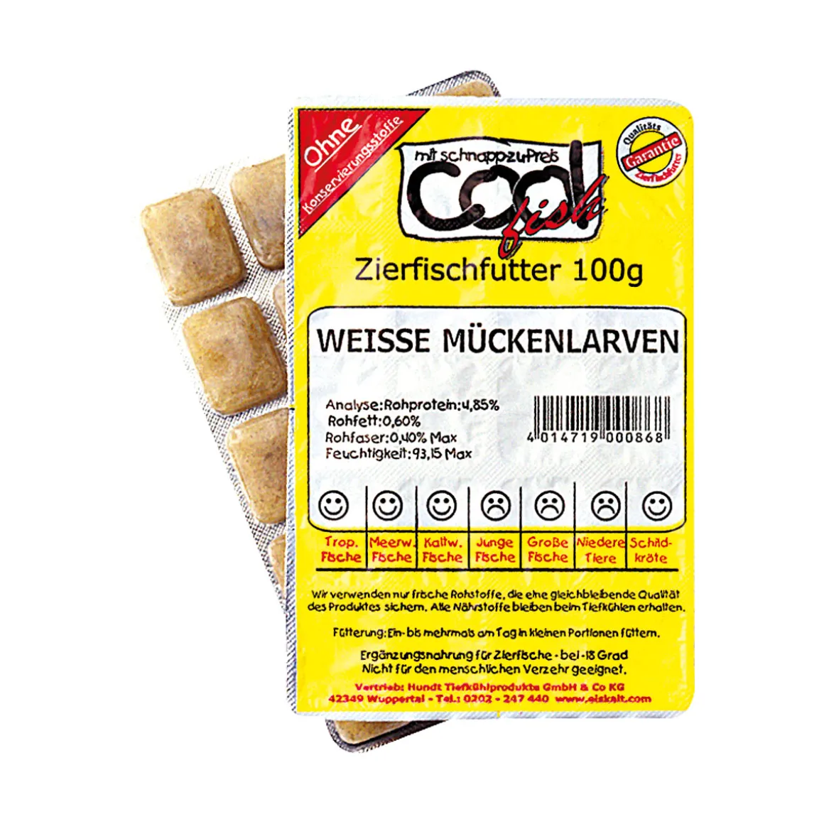 Zusammensetzung: Weiße Mückenlarven 98% und Ascophyllum nodosum (Meeresalge)