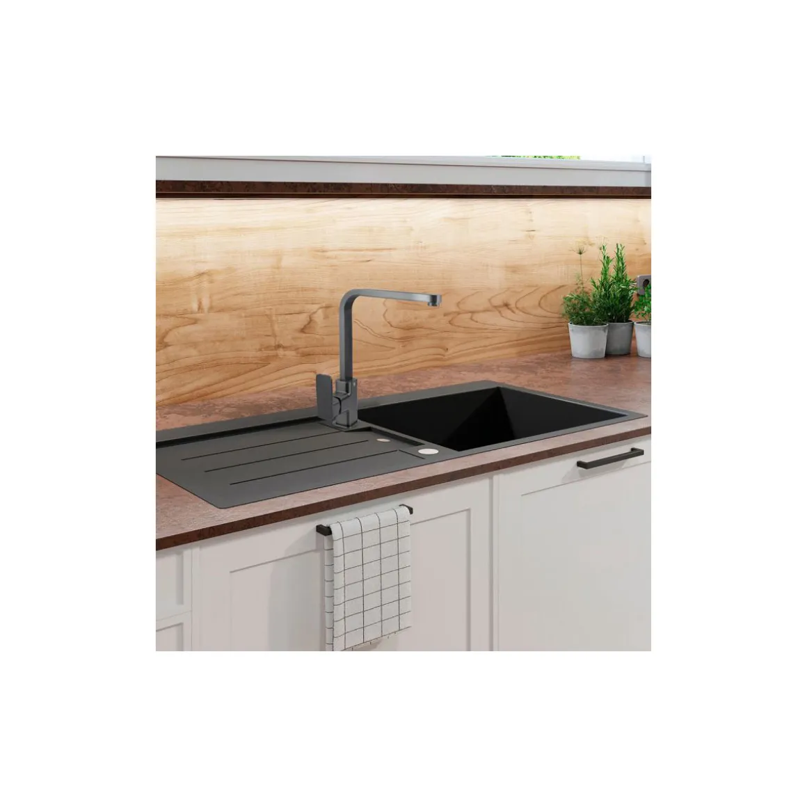 Wir bringen Farbe in Ihre Küche! Die Armatur in der angesagten Trendfarbe „Graphit“ passt ideal zu dunklen Spülbecken und wird damit zu einem optischen