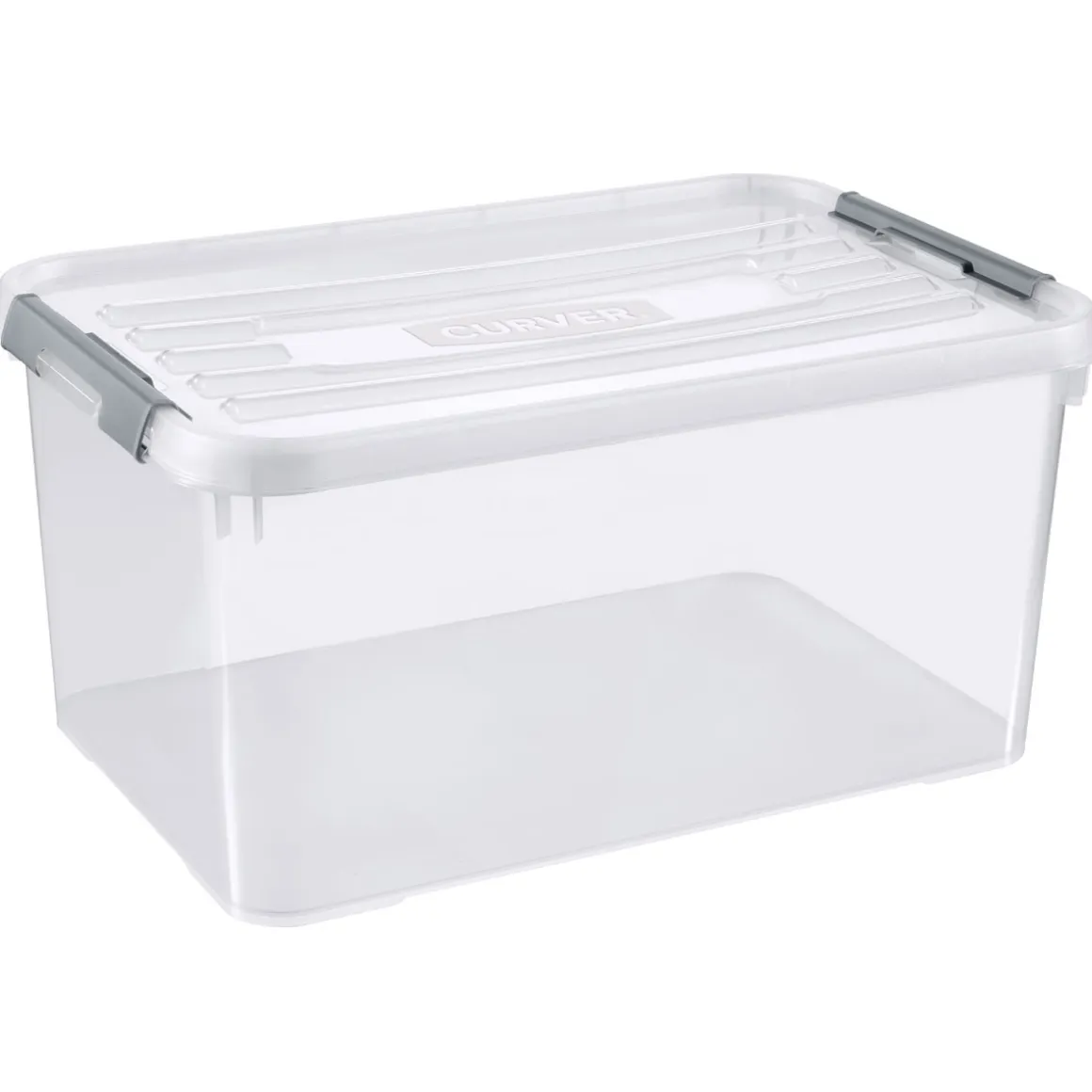 - Transparente Grundfarbe mit weißem Deckel und silberfarbenen Clip Verschlüssen