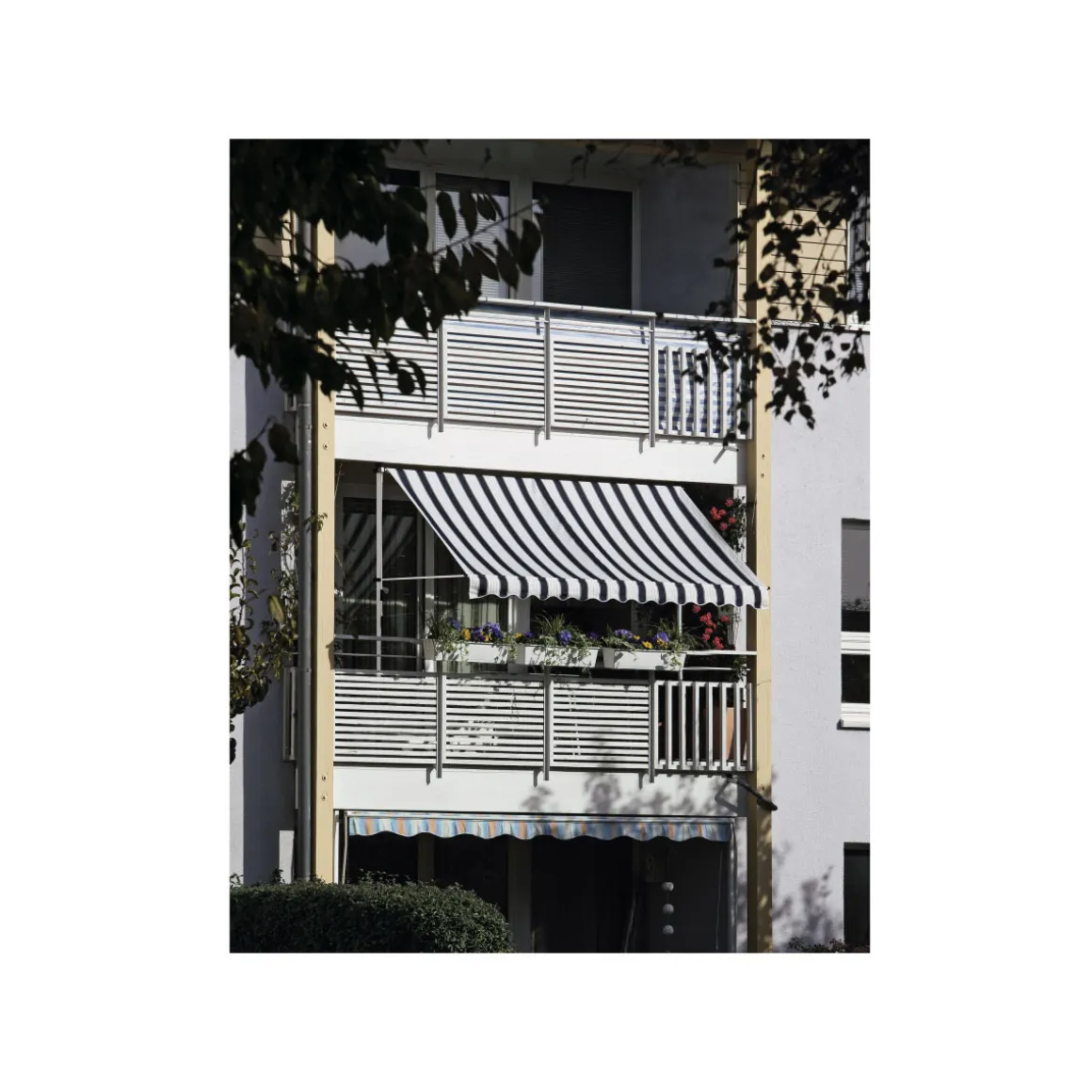Genießen Sie den Sommer auf Ihrem Balkon oder Ihrer Terrasse mit der Fallarm-/Balkonmarkise Lyon in blau-weiß gestreift. Die manuelle Höheneinstellung von 2-3 m ermöglicht eine flexible Nutzung, während der Polyesterbezug für ausreichenden Schutz vor Sonne und leichtem Regen sorgt.