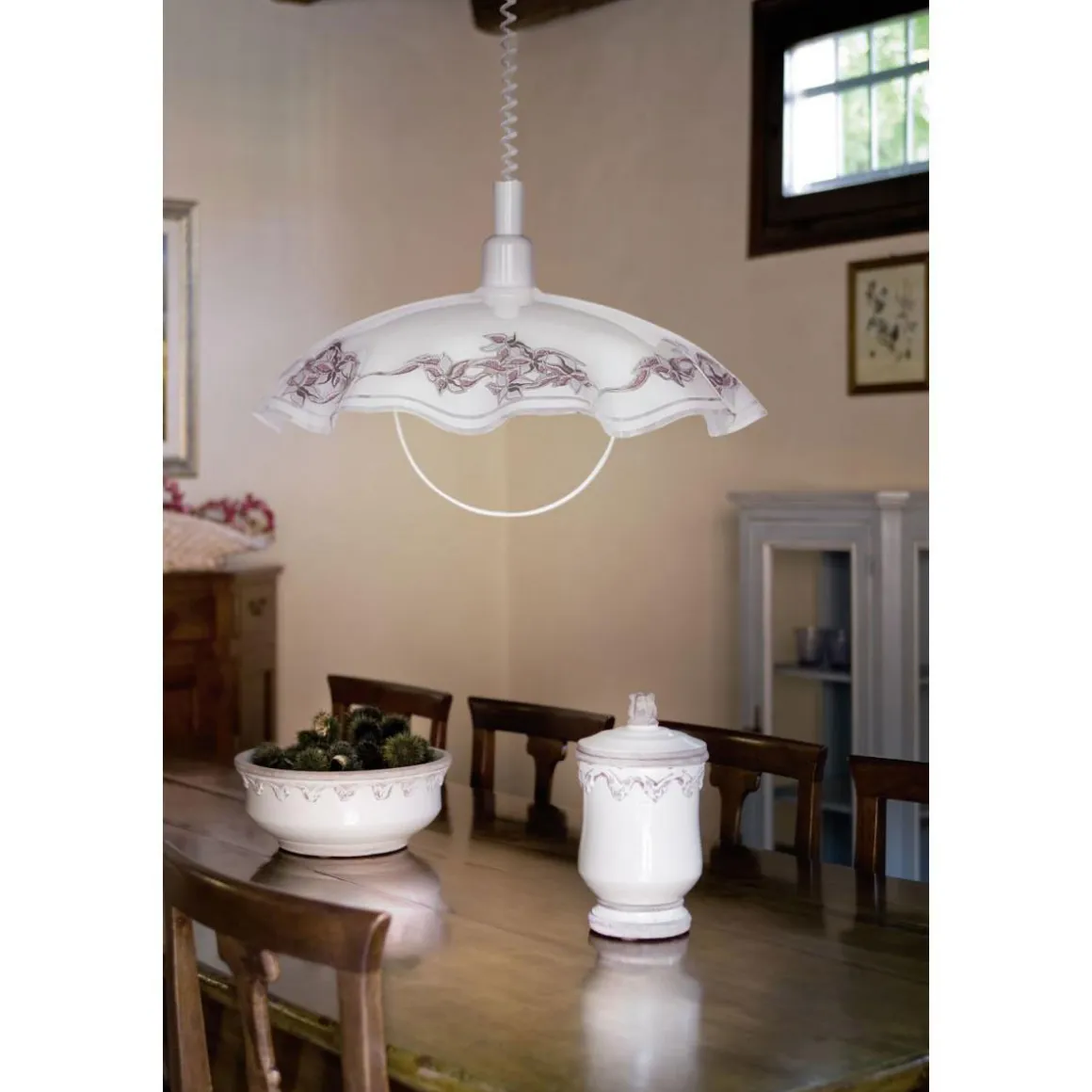 Die Eglo Hängeleuchte Vetro in Weiß überzeugt durch ihr klassisches Design mit einem Hauch von Romantik durch das Blumenmotiv auf dem Glasschirm. Sie eignet sich perfekt als dekorative Beleuchtung in der Küche und schafft eine gemütliche Atmosphäre beim Kochen und Essen. Bitte beachten Sie bei der Wahl des passenden Leuchtmittels die maximale Wattzahl von 60 Watt.