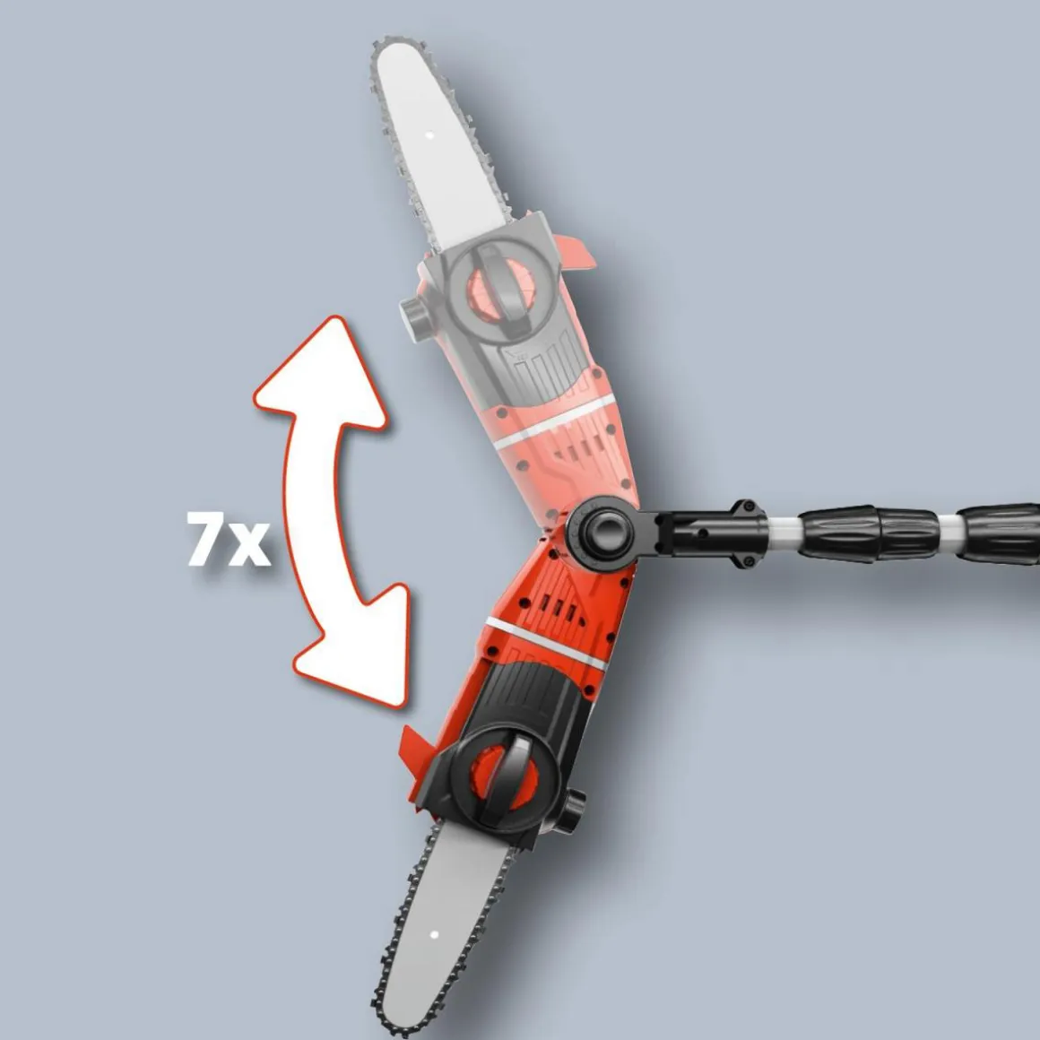 - Hauptgriff ist vierfach neigbar, Zusatzhandgriff ist verstellbar mit Schnellverschluss