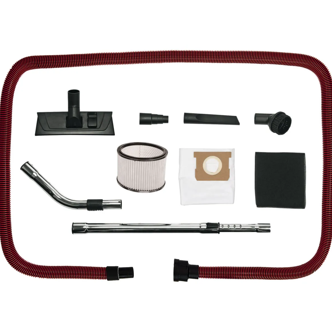 - – Lieferumfang : Nass-Trockensauger , HEPA-Faltenfilter , Vliesbeutel (30L), Schaumstofffilter , hochbelastbarer Saugschlauch (3m), Teleskopsaugrohr , Handgriff , Kombidüse , Fugendüse , Polsterdüse , Adapter zum Werkzeuganschluss