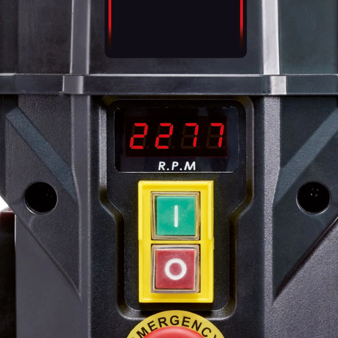 - Ausstattung: Bohrtiefenanschlag, Drehzahlregulierung, Ein-/Ausschalter, Drehrad mit Softgrip, höhenverstellbarer Bohrtisch, LED-Arbeitsleuchte, schwenkbarer Tisch, Späneschutz.