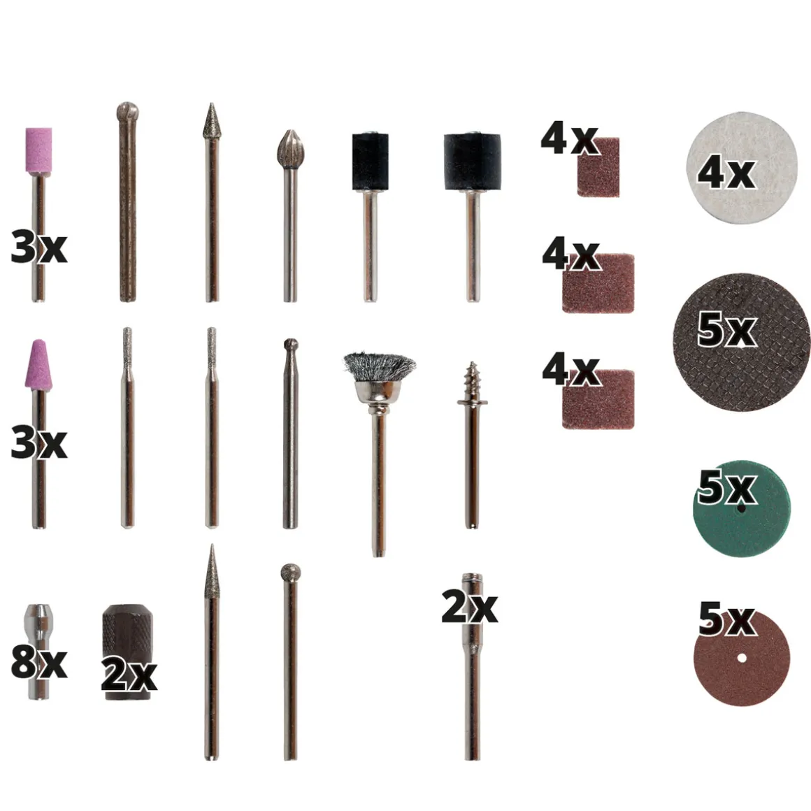 - -2 x Spannzangenset (je vier Spannzangen mit einer Spannmutter, einem Schraubenschlüssel, zwei Aufspanndornen für Schleif- & Trennscheiben sowie zwei Schleifdornen)