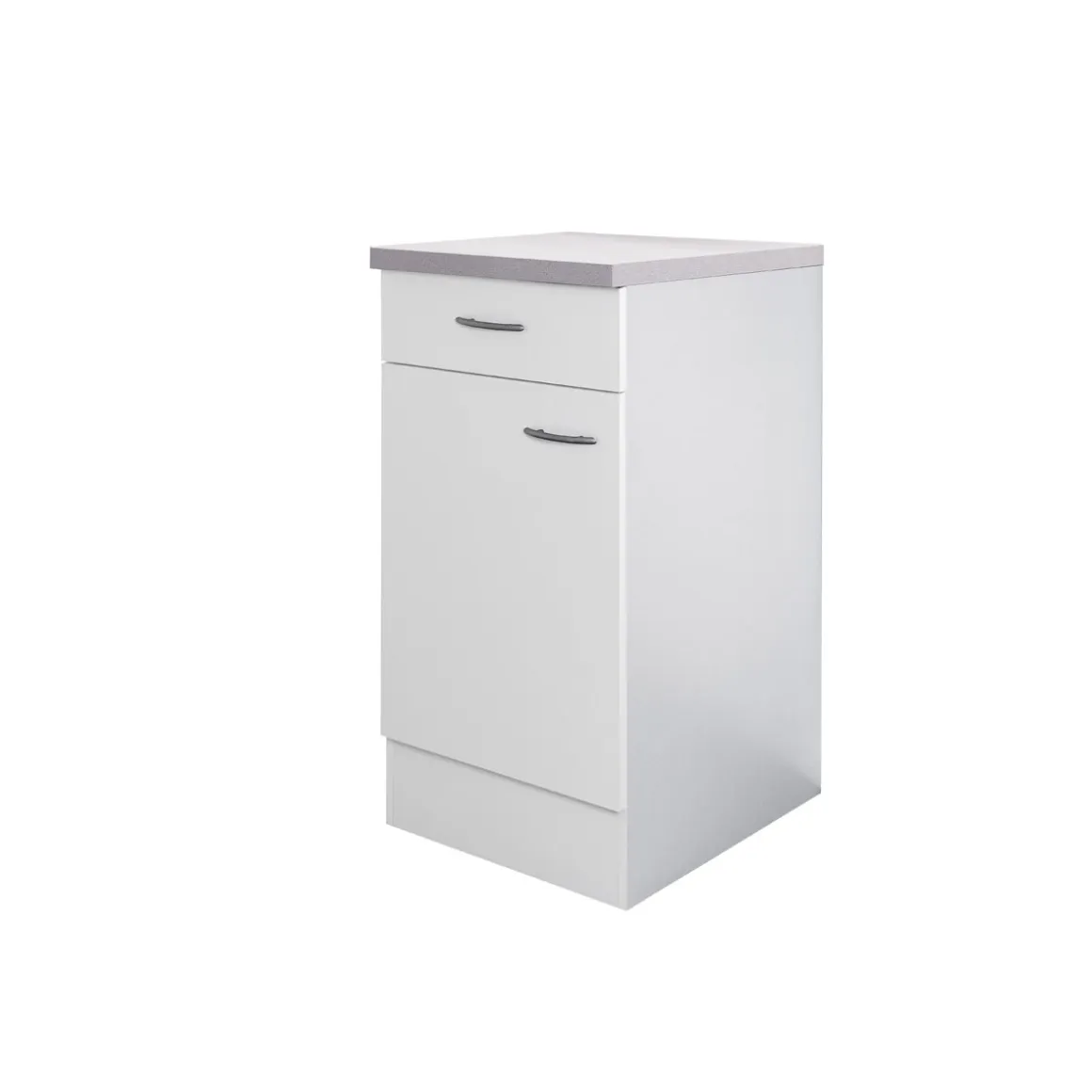 Der Flex-Well Küchenunterschrank Wito in Weiß ist die ideale Ergänzung für Ihre Küche. Mit seinem zeitlosen Design und der praktischen Funktionalität bringt er Ordnung und Stil in Ihren Alltag. Die Kombination aus einer Drehtür, einem Schubkasten und einem verstellbaren Einlegeboden bietet Ihnen maximale Flexibilität bei der Aufbewahrung Ihrer Küchenutensilien. Dank seiner kompakten Maße von 40x85x60 cm passt er auch in kleinere Räume perfekt hinein. Lassen Sie sich von diesem hochwertigen Unterschrank begeistern und machen Sie Ihre Küche zu einem Ort, an dem Kochen zum Vergnügen wird.