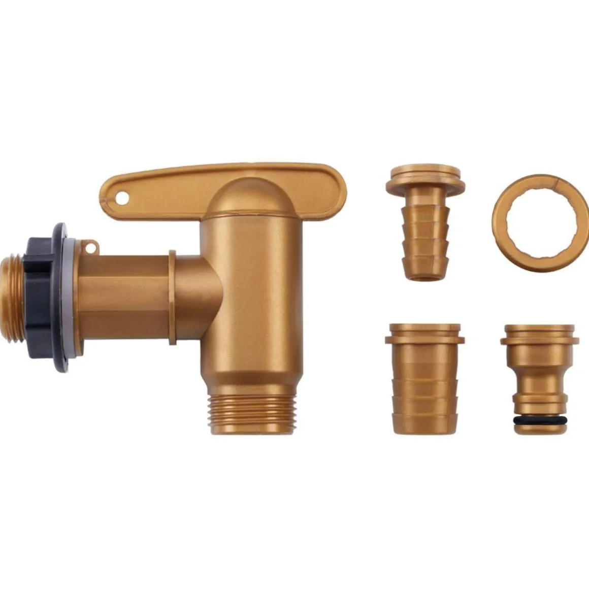 - – Lieferumfang: Hahn mit Dichtung und Verschraubung, Anschlussstutzen für handelsübliche Schlauchkupplung (13 mm / 1/2 Zoll und 19 mm / 3/4 Zoll), Überwurfmutter und Dichtungen