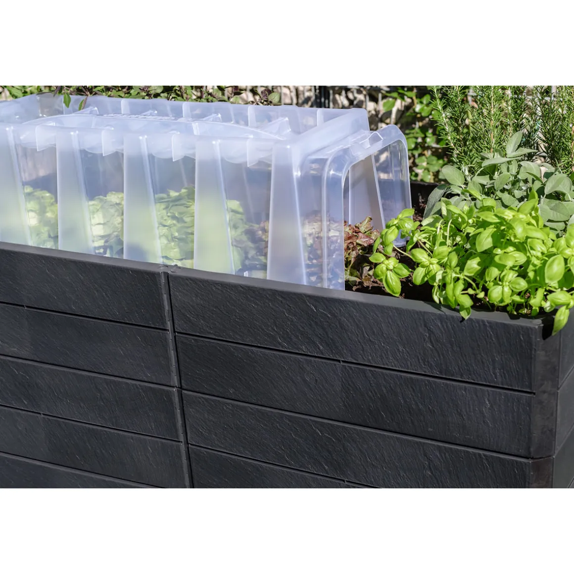 Garantia ERGO Hochbeet QUADRO U L 75 – Das Hochbeet in U-Form. Set bestehend aus 36 Paneelen inkl. Steckverbinder. Ergonomisches Arbeiten in bequemer Höhe – jederzeit flexibel erweiterbar. Das ERGO QUADRO U Hochbeetsystem ist ein modular konzipiertes Hochbeet, mit vielfältigen Gestaltungsmöglichkeiten zum Anbau untschiedlichster Pflanzen. Das QUADRO U bietet mit seiner U-Form eine extra große Anbaufläche, ideal für Selbstversorger. Von einem Standort aus können alle Bereiche des U-förmigen Hochbeets bequem erreicht werden. Das ERGO QUADRO Hochbeet überzeugt ebenfalls als Blickfang in Ihrem Garten durch die dekorative Oberfläche in 3D-Steinoptik mit originalgetreuer Schieferstruktur, moderner Farbgebung, Langlebigkeit und UV-Stabilität. Bereits bei der Entwicklung eines GARANTIA Hochbeets wird sehr viel Wert auf ein nachhaltiges Produktdesign gelegt. Alle Hochbeete werden aus Recyclingkunststoff hergestellt und sind zu 100 % recycelbar. Im Gegensatz zu Hochbeeten aus anderen Materialien muss das ERGO QUADRO Hochbeet nicht gestrichen oder innen mit teurer Folie ausgelegt werden. Das im Lieferumfang enthaltene FLORA Wassersparsystem, schafft Ihnen einen reduzierten Wasserverbrauch und ein schnelleres Wachstum Ihrer Pflanzen. Das ERGO QUADRO Hochbeet kann auch multifunktional als offener Komposter oder Kräuterbeet genutzt werden. Durch die Befüllung mit Kompost und Gartenerde entsteht ein idealer Nährboden für die Pflanzenanzucht. Dank des guten Klimas im Inneren des Hochbeets können Pflanzen schneller reifen – unabhängig von der eigentlichen Bodenbeschaffenheit in Ihrem Garten. Neben Blühpflanzen gedeihen auch viele Gemüsesorten sowie Küchenkräuter und Früchte hervorragend im ERGO QUADRO Hochbeet, eine ertragreiche und gesunde Ernte ist vorprogrammiert. Ungeziefer und Schnecken haben es schwerer die Pflanzen in Ihrem Hochbeet zu erreichen. Dieses Komplett-Set besteht aus insgesamt 36 Paneelen, welche durch Steckverbinder einfach und problemlos ohne Werkzeug zusammengesteckt werden. Somit erreicht man eine Höhe von 75 cm und ein U-förmiges Grundmaß von 240 x 160 cm. Qualität Made in Germany. Maße: 240 x 160 x 75 cm (L x B x H).