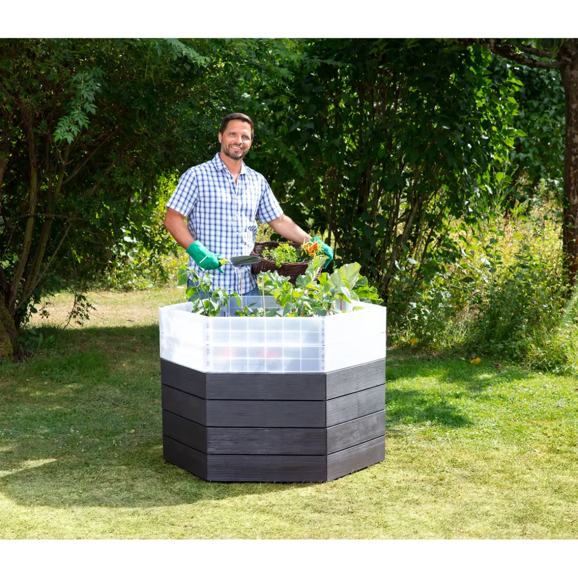 Mit dem Garantia Hochbeet Ergo Turbo L 75 Wood inkl. FLORA wird das Gärtnern zum Erlebnis. Das sechseckige, braune Hochbeet mit Holzoptik-Dekor bietet nicht nur Platz für eine Vielzahl von Pflanzen, sondern auch ein integriertes Bewässerungssystem und Wetterschutz. Die Montage ist kinderleicht und das Material zu 100% recycelbar.