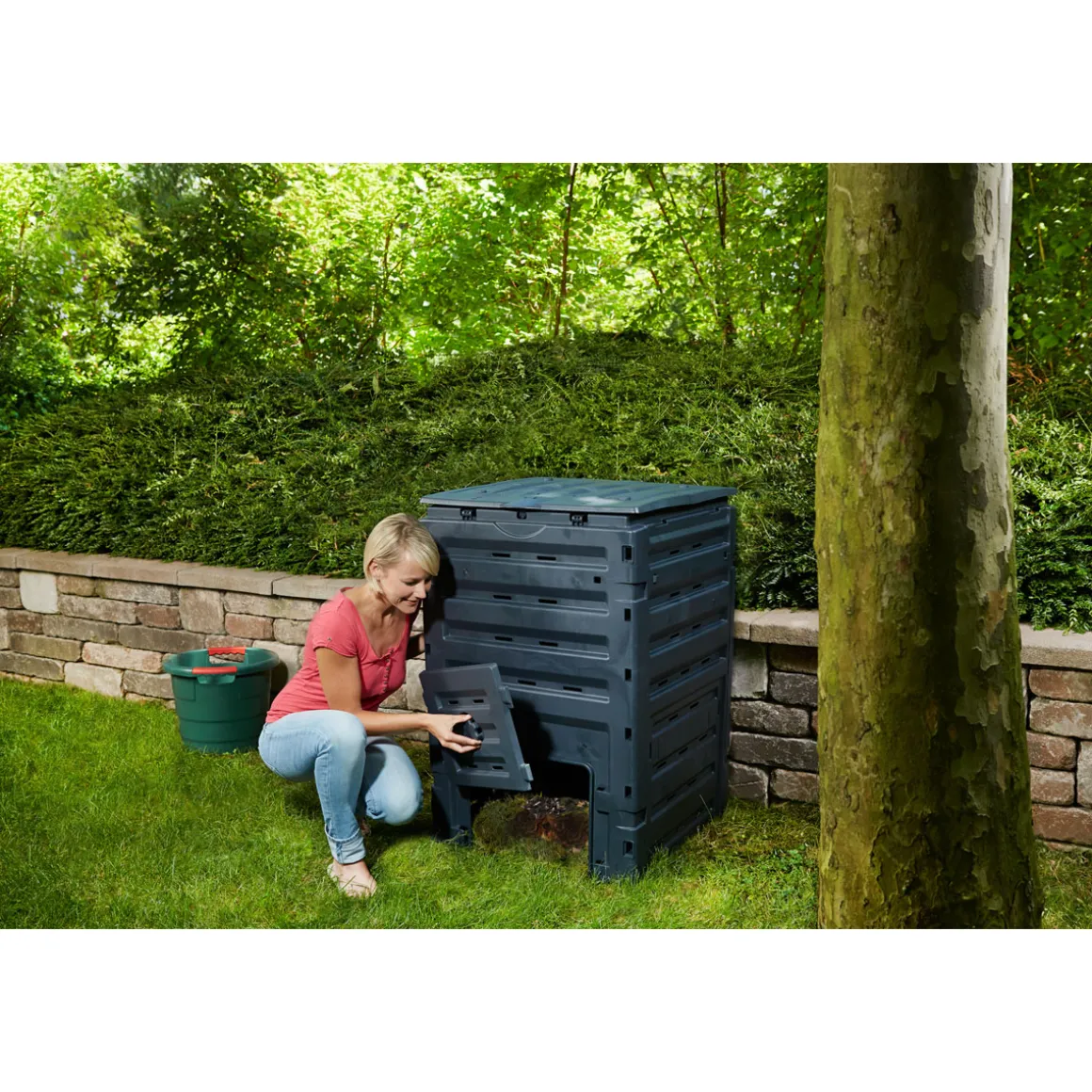 - Windsicherer Deckel mit praktischer Entnahmeklappe ermöglicht eine unkomplizierte Entnahme des fertigen Komposts
