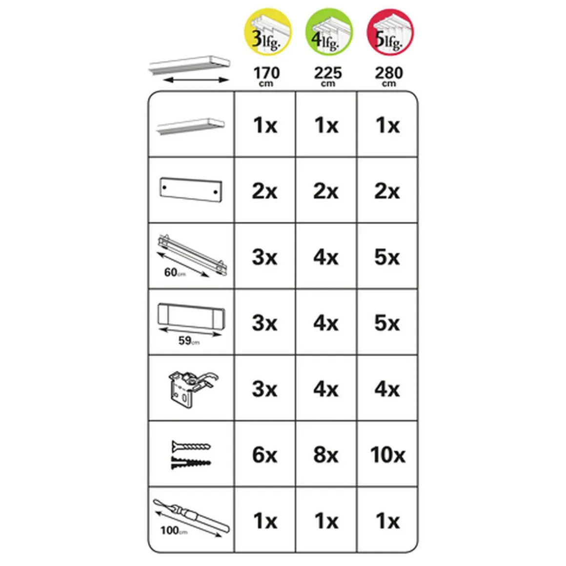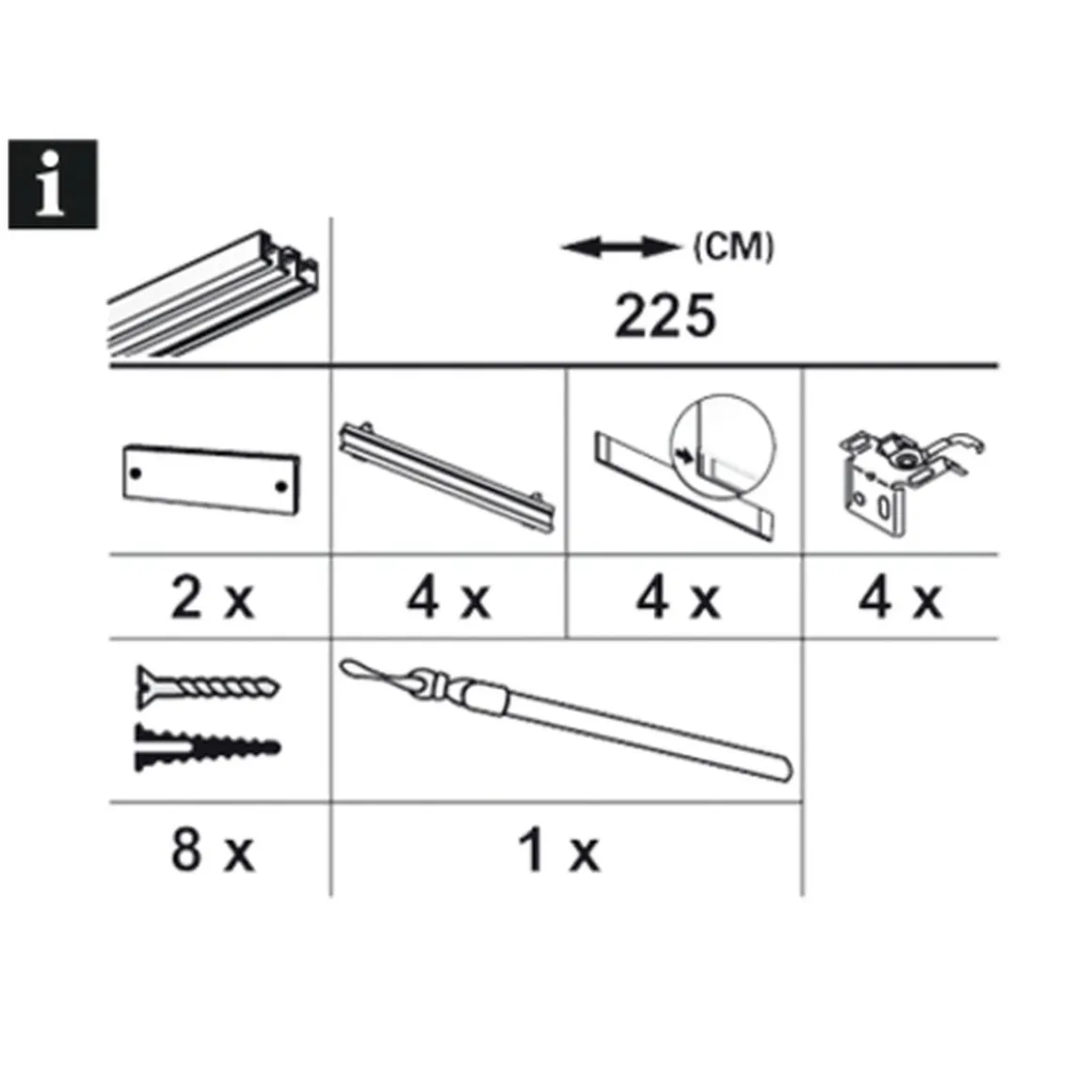 - Setbestandteile: Flächenschiene, vierläufiger Paneelwagen, 4 Beschwerungsprofile mit Endstücken, 100 cm langer Schleuderstab