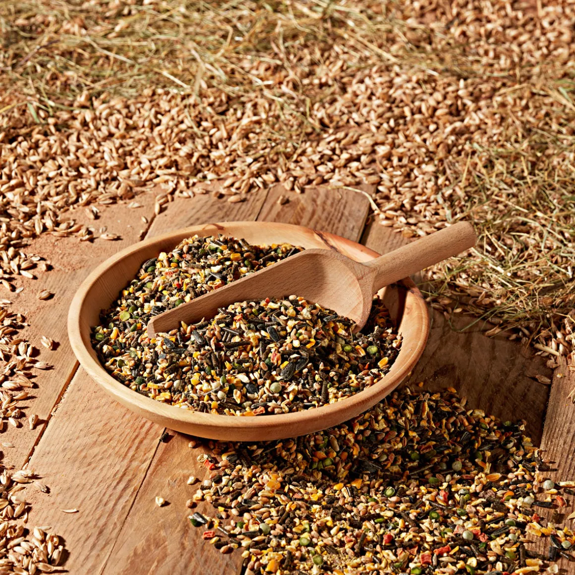 Alleinfuttermittel für Legehennen, Getreidemix und Spezialpellets mit Muschelschrot, Karotten, Oregano, Sonnenblumenkernen und Leinöl.