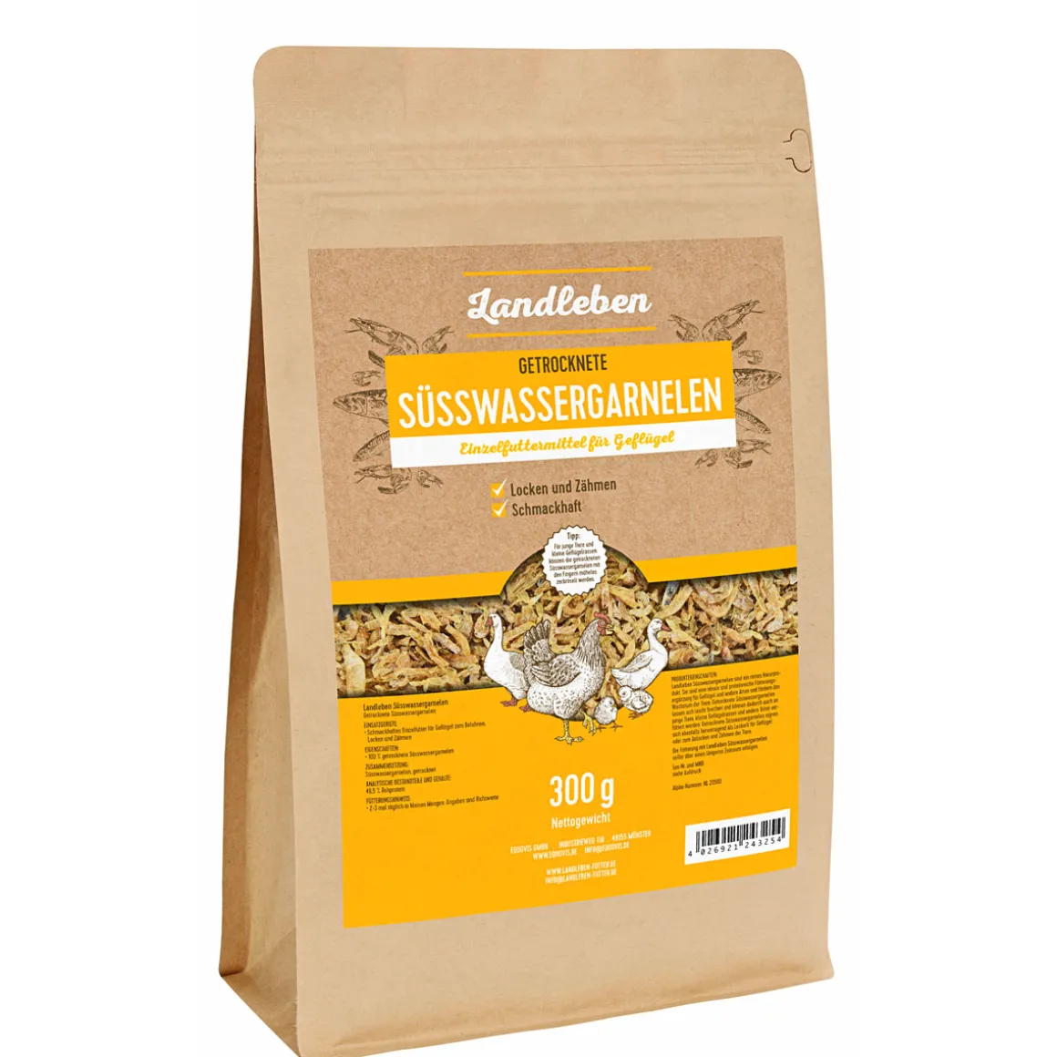 Landleben Süsswassergarnelen sind ein reines Naturprodukt. Sie sind eine ideale und proteinreiche Fütterungsergänzung für Geflügel und andere Arten und fördern das Wachstum der Tiere. Getrocknete Süsswassergarnelen lassen sich leicht brechen und können dadurch auch an junge Tiere, kleine Geflügelrassen und andere Arten verfüttert werden. Getrocknete Süsswassergarnelen eignen sich ebenfalls hervorragend als Leckerli für Geflügel oder zum Anlocken und Zähmen der Tiere.