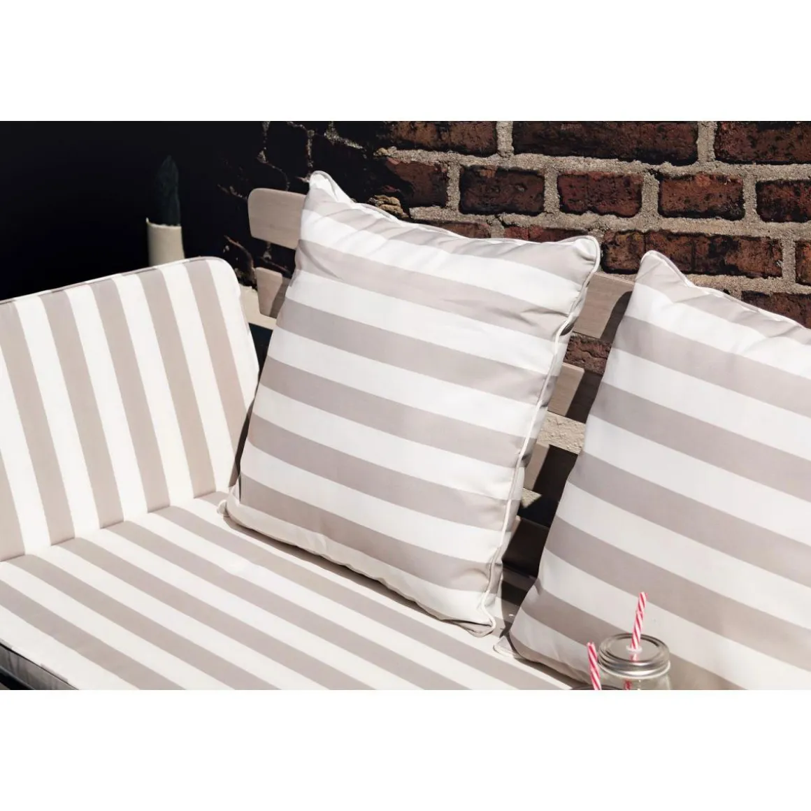- Braune Grundfarbe mit grau/weiß gestreiften Auflagen