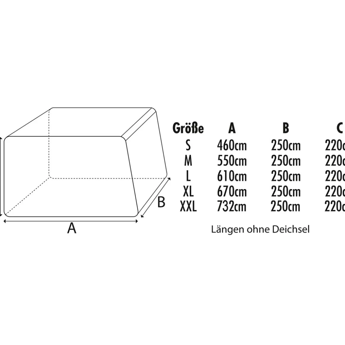 - Maße (LxBxH): 730 x 250 x 220 cm