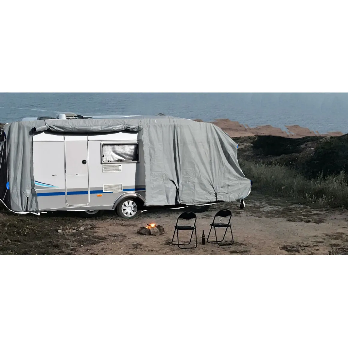 Die neuen Reflektoren an Vorder- und Hinterseite der Abdeckplane sorgen für verbesserte Sichtbarkeit- sowohl tagsüber als auch nachts. Die stabilen Spanngurte können Sie individuell einstellen, sodass die Plane fest um Ihren Wohnwagen gespannt ist.