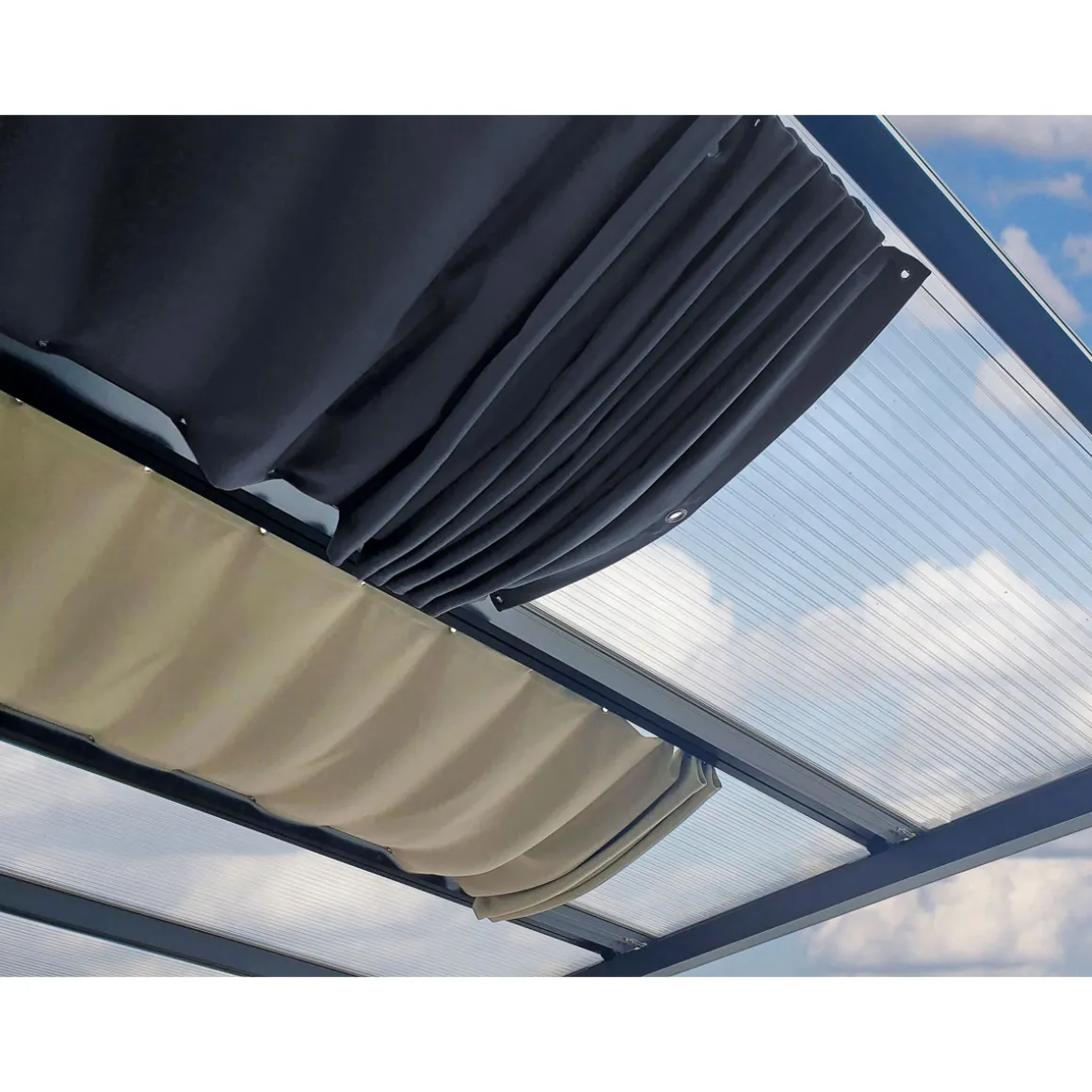 Edelstahl, Acrylfaserbespannung, UV-beständig, knitterfrei, waschbar, inklusive Bausatz und Zubehör, individuelle Sonderanfertigung bis 5 m Länge und 1,15 m Breite, inklusive Lieferung und Befestigungsmaterial, passend für Terrassendächer und andere Überdachungen. Erhältlich in verschiedenen Farben.