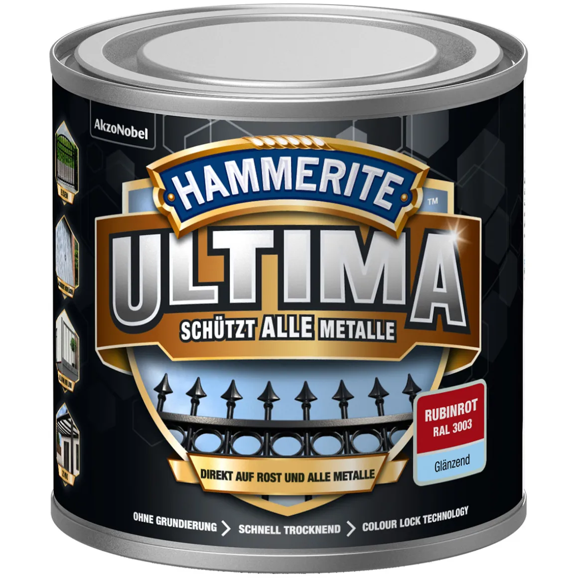 Der Hammerite Metallschutzlack Ultima in rubinrot glänzend bietet nicht nur eine ansprechende Optik für Ihre metallischen Gegenstände im Außenbereich. Dank seiner Colour Lock Technologie sorgt er auch dafür, dass die Farbe lange erhalten bleibt und vor Ausbleichen geschützt wird. Die schnelltrocknende Formel ermöglicht zudem ein einfaches und schnelles Auftragen des Lacks. Mit seiner hohen Deckkraft und Witterungsbeständigkeit bietet er einen zuverlässigen Schutz gegen Rostbildung und andere Umwelteinflüsse. Bestellen Sie jetzt den Hammerite Metallschutzlack Ultima bei Online-Shop!