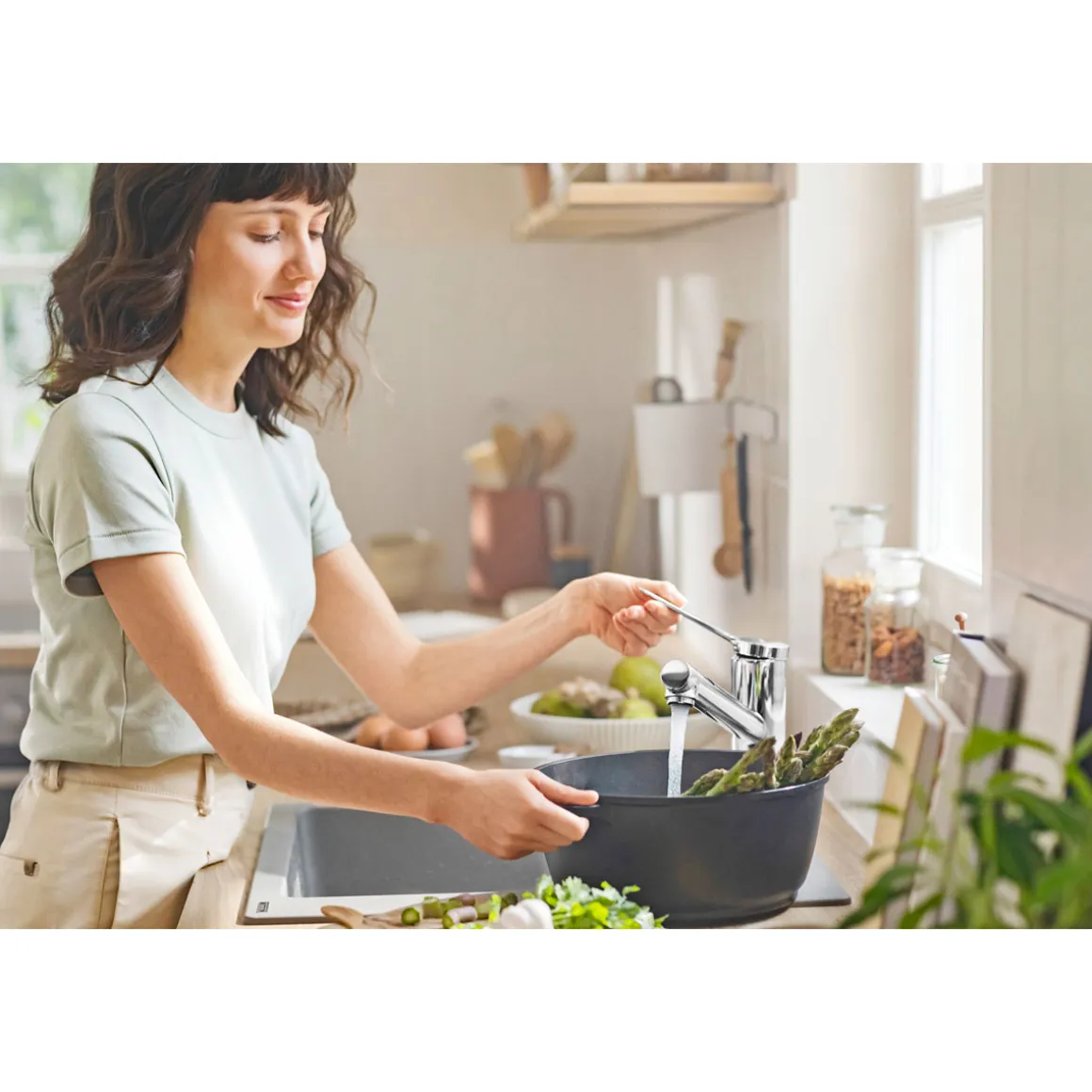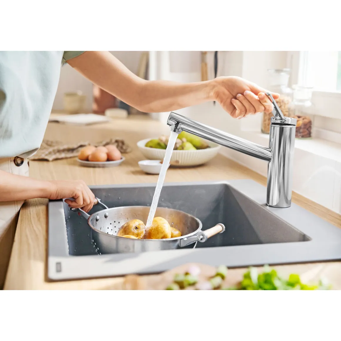Beschreibt den großzügigen Raum, der zwischen Küchenarmatur und Spüle entsteht – vertikal und horizontal. Diese hochwertigen Mischer sind höchst benutzerfreundlich und verfügen über einen flexiblen Schwenkbereich. Für maximale Bewegungsfreiheit.