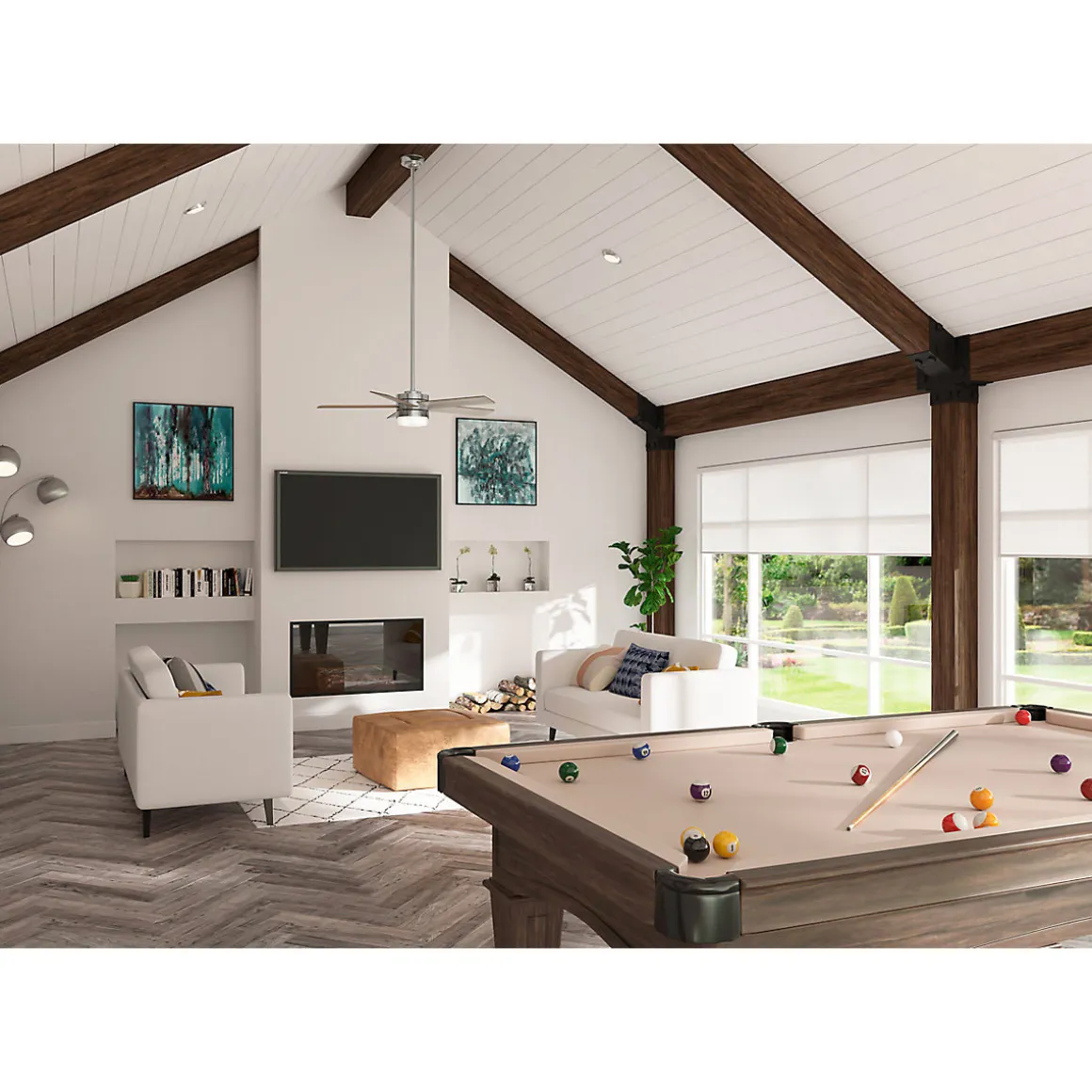 Der umkehrbare Motor ermöglicht es Ihnen, die Richtung Ihres Ventilators vom Abluftmodus im Sommer, der hilft, den Raum zu kühlen, in den Aufluftmodus im Winter zu ändern, um eingeschlossene warme Luft in der Nähe der Decke zu zirkulieren.