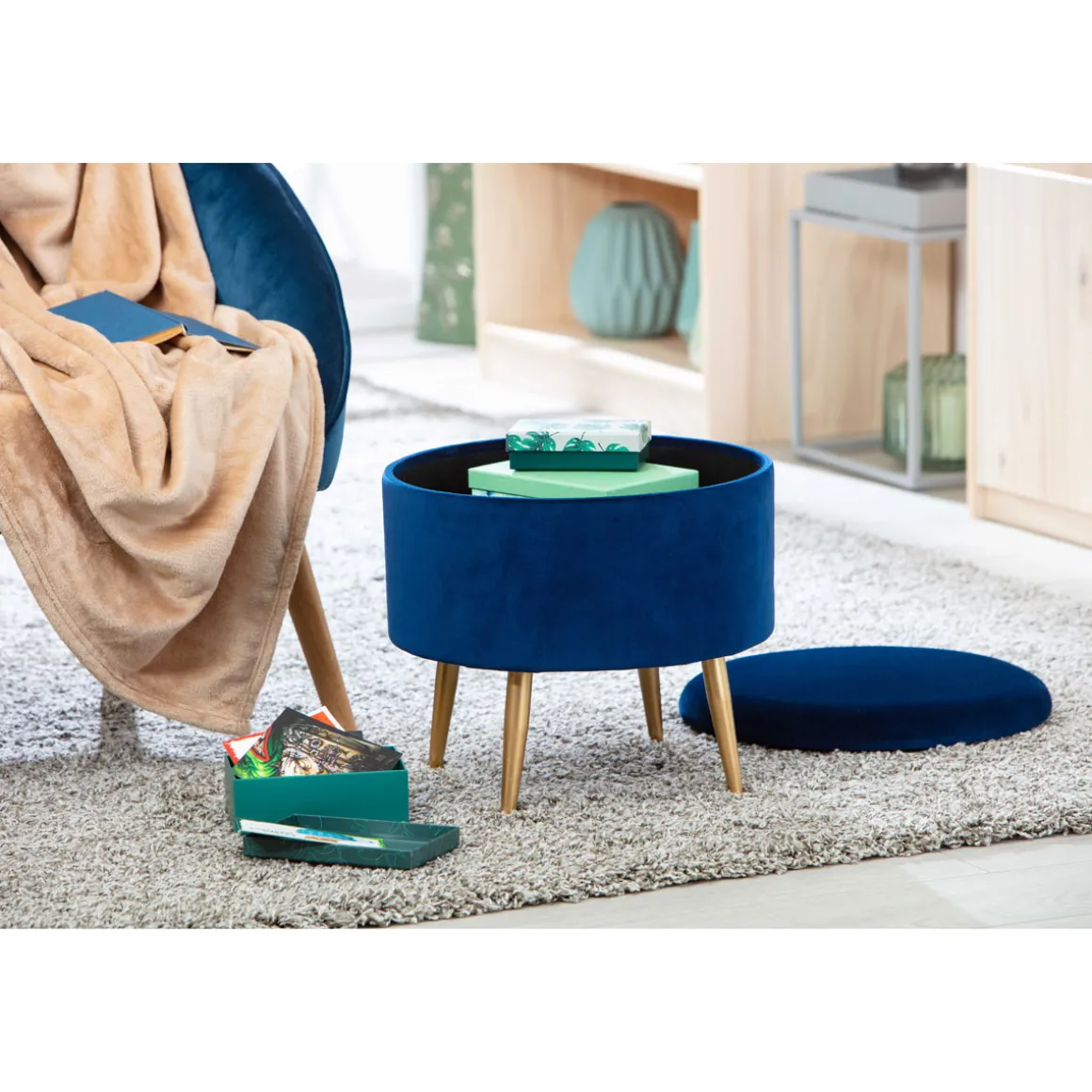 Der moderne Sitzhocker ist mit wertigem Samt bezogen und in drei trendigen Farben erhältlich: Schwarz, blau und grün. Er ist bequem gepolstert und unter der abnehmbaren Sitzfläche befindet sich sehr viel praktischer Stauraum zum Verstauen von Accessoires wie Schal, Handschuhe und Mützen. Alle drei Farben ergänzen hervorragend das goldfarbene Metallgestell. • Moderner Sitzhocker• Abnehmbare Sitzfläche für Stauraum• Wahlweise in schwarz, blau oder grün• Material: Samt, 100 % Polyester, MDF, Metall• Aufgebaute Maße: ca. 41 x 41 x 38 cm BxTxH