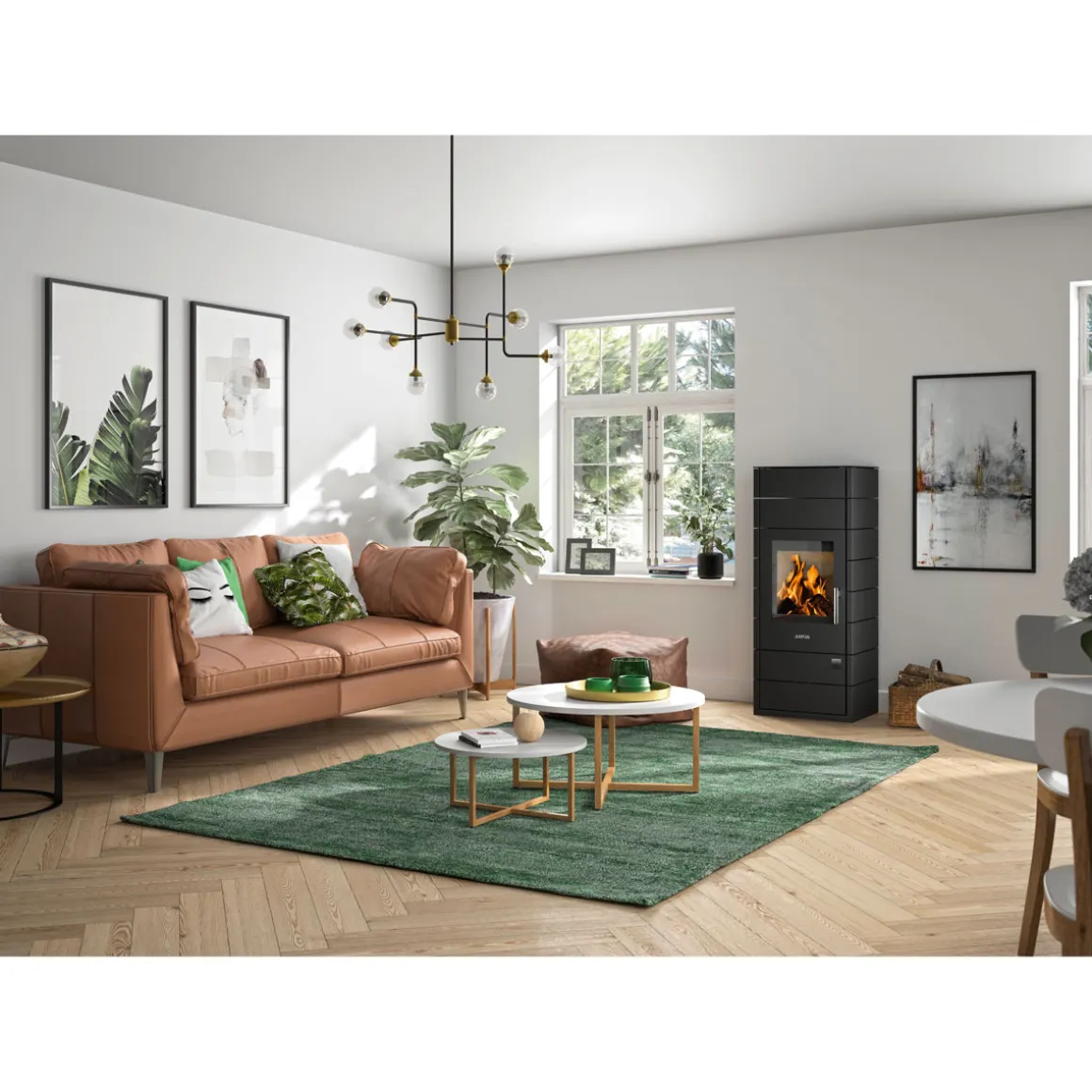 Der Justus Kaminofen Tova Stahl Schwarz eignet sich perfekt für alle Kunden, die eine gemütliche und warme Atmosphäre in ihrem Wohnraum schaffen möchten. Mit einer Nennwärmeleistung von 7 kW und einem Raumheizvermögen von 144 m³ ist er ideal für mittelgroße Räume geeignet.