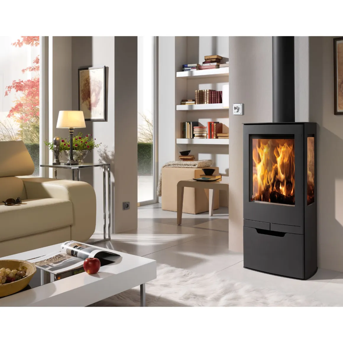 Der Panadero Kaminofen ZINC Ecodesign vereint modernes Design mit hoher Effizienz und Funktionalität. Mit einer Nennwärmeleistung von 7,9 kW und einem Raumheizvermögen von bis zu 240 m³ sorgt er schnell für angenehme Temperaturen im Raum. Dank seiner schwarzen Metallic-Verkleidung fügt er sich perfekt in jeden Wohnraum ein und wird zum optischen Highlight. Auch die technischen Eigenschaften wie der Aschebehälter oder die Vermiculit-Innenverkleidung überzeugen auf ganzer Linie. Wenn Sie also auf der Suche nach einem zuverlässigen Wärmespender sind, der zugleich stilvoll aussieht, dann ist der Panadero Kaminofen ZINC Ecodesign genau das Richtige für Sie!