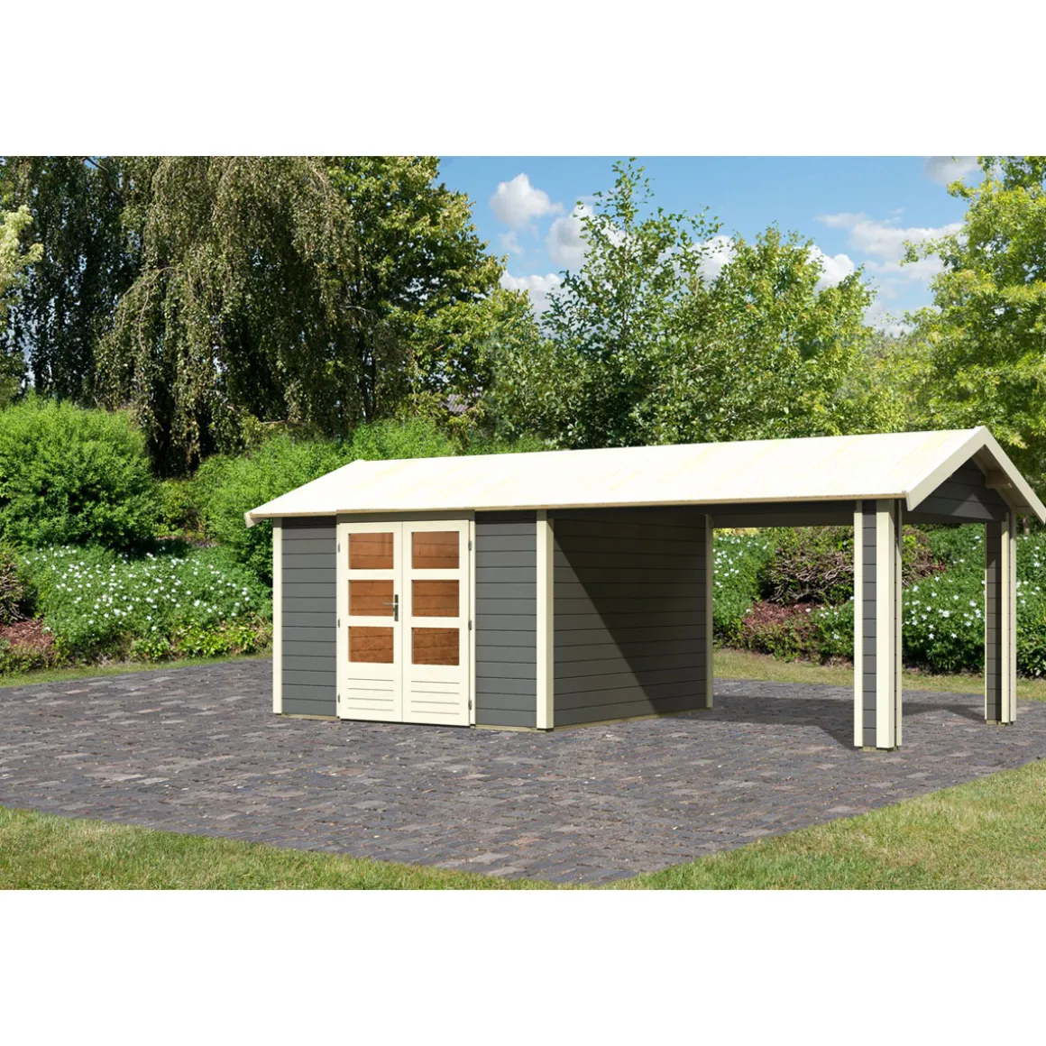 Karibu Blockbohlenhaus Theres 7 terragrau mit Dachausbauelement