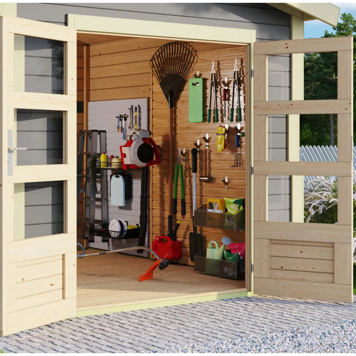Das Gartenhaus wird aus 28 mm starken Wandbrettern aus nordischer Fichte im Steck-/Schraubsystem gefertigt und gewährleistet somit einen einfachen Aufbau und eine stabile Konstruktion. Das Satteldach besteht aus Massivholzdach. Die Grundfläche beträgt 8,65 m² bei einem umbauten Raum von 19,4 m³. Mit einer Seitenhöhe von 204 cm und einer Firsthöhe von 250 cm bietet das Gartenhaus optimale Raumnutzung. Das Gartenhaus ohne Anbauten hat ein Sockelmaß von 300×300 cm. Bodenbalken sorgen für den Schutz von unten und werden unter das Gartenhaus gelegt. Durch die Kesseldruckimprägnierung der Bodenbalken sind diese vor Witterungseinflüssen und holzzersetzenden Pilzen bereits geschützt. Die praktische und vormontierte Tür sorgt mit Ihren großzügigen Abmessungen und dem Massivholzrahmen für einen einfachen Zutritt in das Gartenhaus und sichert den Inhalt nebenbei effektiv vor unbefugtem Zugriff. Die Verglasung der Lichtausschnitte sorgt für großzügigen Tageslichteinfall.