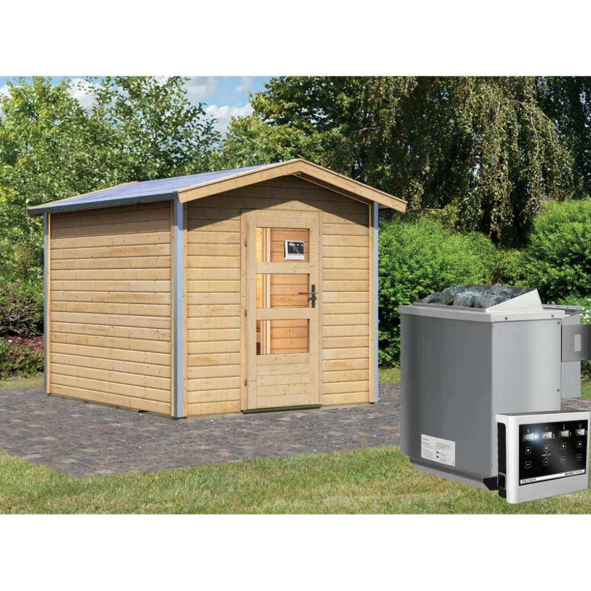 Erleben Sie pure Entspannung in Ihrem eigenen Zuhause mit dem Karibu Saunahaus Bosse 1. Aus hochwertiger nordischer Fichte gefertigt, bietet es Platz für bis zu drei Personen und verfügt über einen modernen Türzugang. Mit einem Bio-Ofen und einer externen Steuerung können Sie die Temperatur individuell einstellen und sich so eine wohltuende Atmosphäre schaffen.