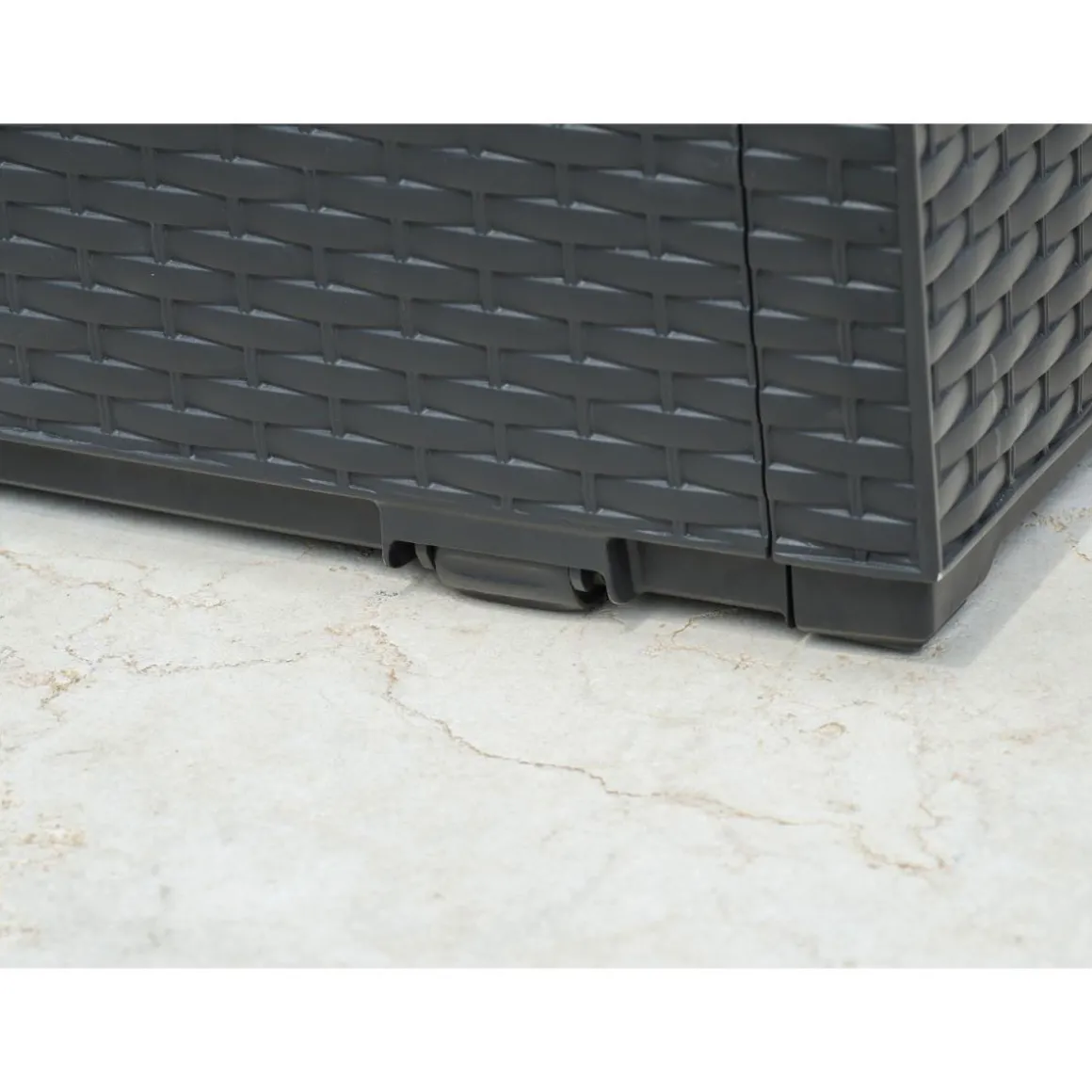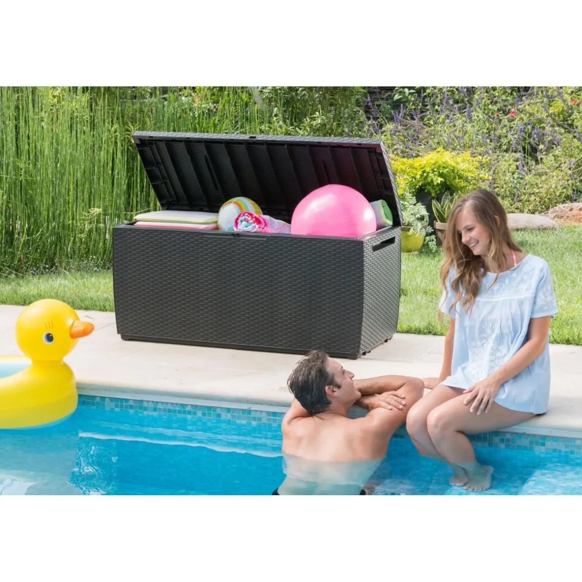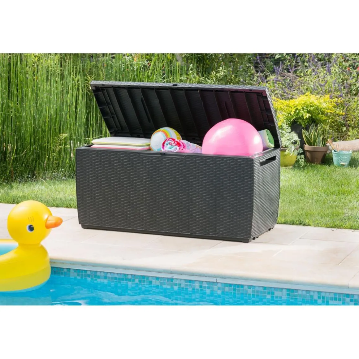 Mit der Keter Aufbewahrungsbox Rattan Style Box Capri haben Sie die Möglichkeit, Ihre Gartenutensilien stilvoll und sicher aufzubewahren. Die Box ist in einer eleganten Rattanoptik gehalten und bietet ein Fassungsvermögen von 305 Litern. Dank ihrer Wetter- und UV-Beständigkeit können Sie die Box das ganze Jahr über im Freien stehen lassen.