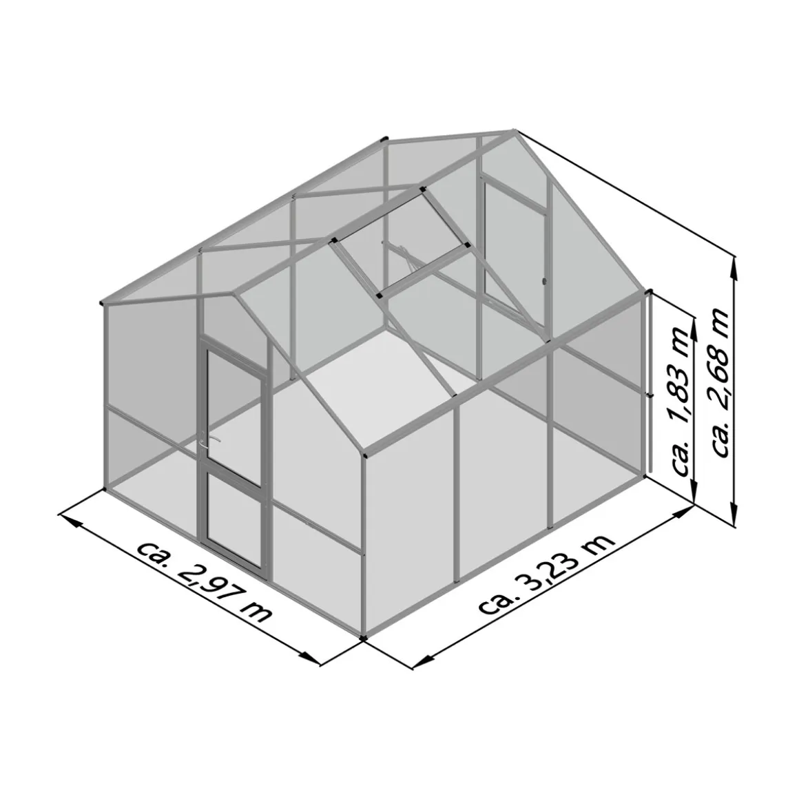 Das KGT Gewächshaus Lilie III ist ein großartiger Ort, um Ihre Pflanzen zu züchten und zu pflegen. Mit einer Grundfläche von 9,6 m² bietet es ausreichend Platz für eine Vielzahl von Pflanzen und Gemüsearten. Das robuste Aluminiumprofil in anthrazit-grauer Farbe (DB 703) und die sichere Verglasungstechnik machen das Gewächshaus besonders witterungsbeständig.